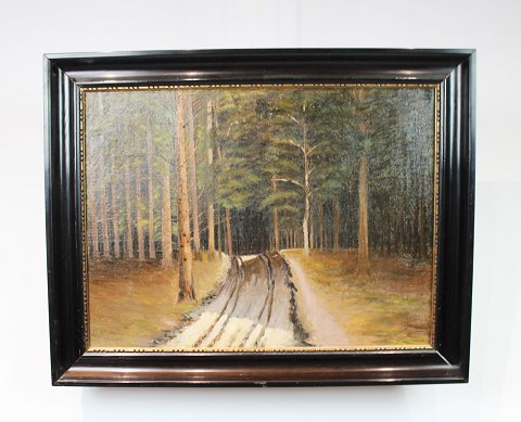 Painting on the canvas in a gold frame of a church motif in yellow and red shades from around the 1930s.