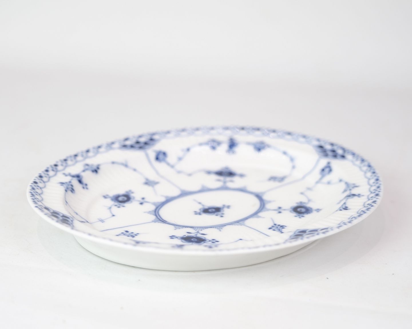 Oval dish marked 1/750 from Royal Copenhagen. Made of porcelain with classic blue fluting half lace design. Hand painted in blue decoration.