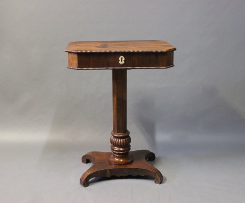 Octagonal column table from Italy, dated to the 1850s. The table is richly decorated with hand-laid intarsia, which emphasizes the geometric shapes and the overall decorative expression.