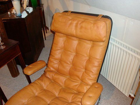 Solddeck chair in cognac leather with frame in chrome designed by Bruno Mathsson 5000 m2 showroom