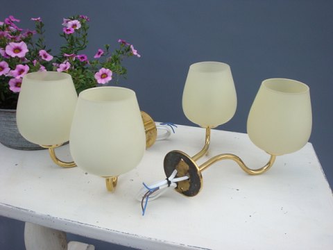 Sold2 pcs wall lamps in brass with 2 opal glass. By Vilhelm Lauritzen. The lamps are reconditioned.