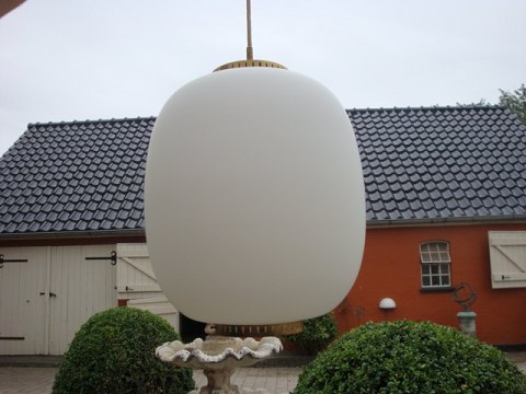 SolgtKinapendel af Bent Karlby. Opalglas og med messing i bund & top. Måler 39 cm i højden og Ø98.5cm