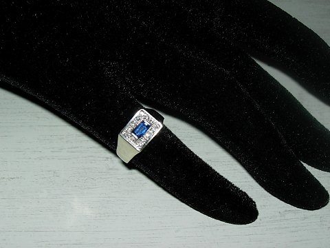 Hvidguldsring med safir og 14 brillianter. Str. 55.