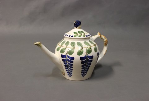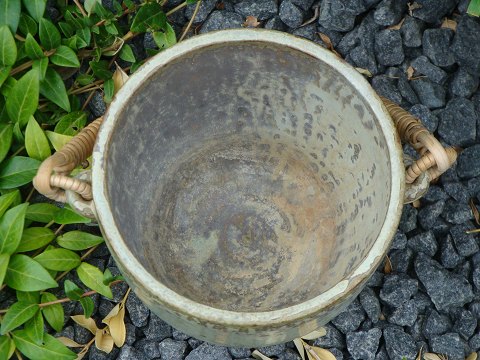 SolgtKrukke i sandfarvede nuancer med flettet håndtag designet og signeret af Arne Bang nr 15.