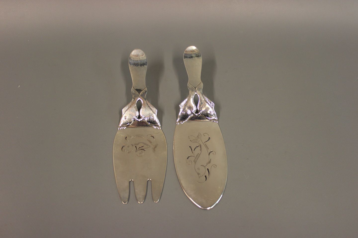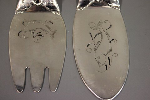 Fish serving set in hallmarked silver from 1941 with fine silver fish ornaments on forks and spades. 5000m2 showroom.