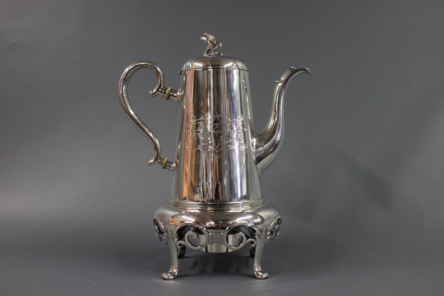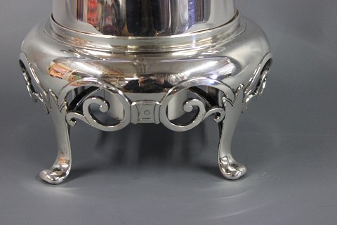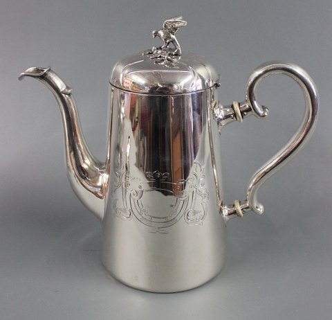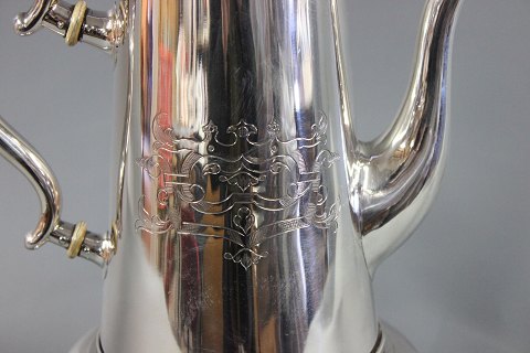 SolgtUnika sølv kaffekande med tilhørende fyrfad designet af Anton Michelsen i 1854 stempelt med tretårne og A:M. Vægt Total : 1325g højde 31 cm kanden alene måler 23 cm.