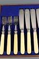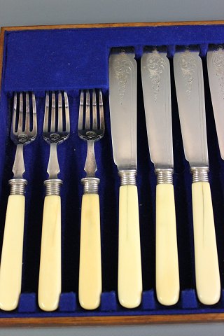 SolgtMappin og Webb 12 pers. fiske bestik med tilhørende boks med blå fløjl indvendigt. Bestikket er i forsølvet sølv med elfenbens håndtag. Sættet er fra England og fra år 1880.