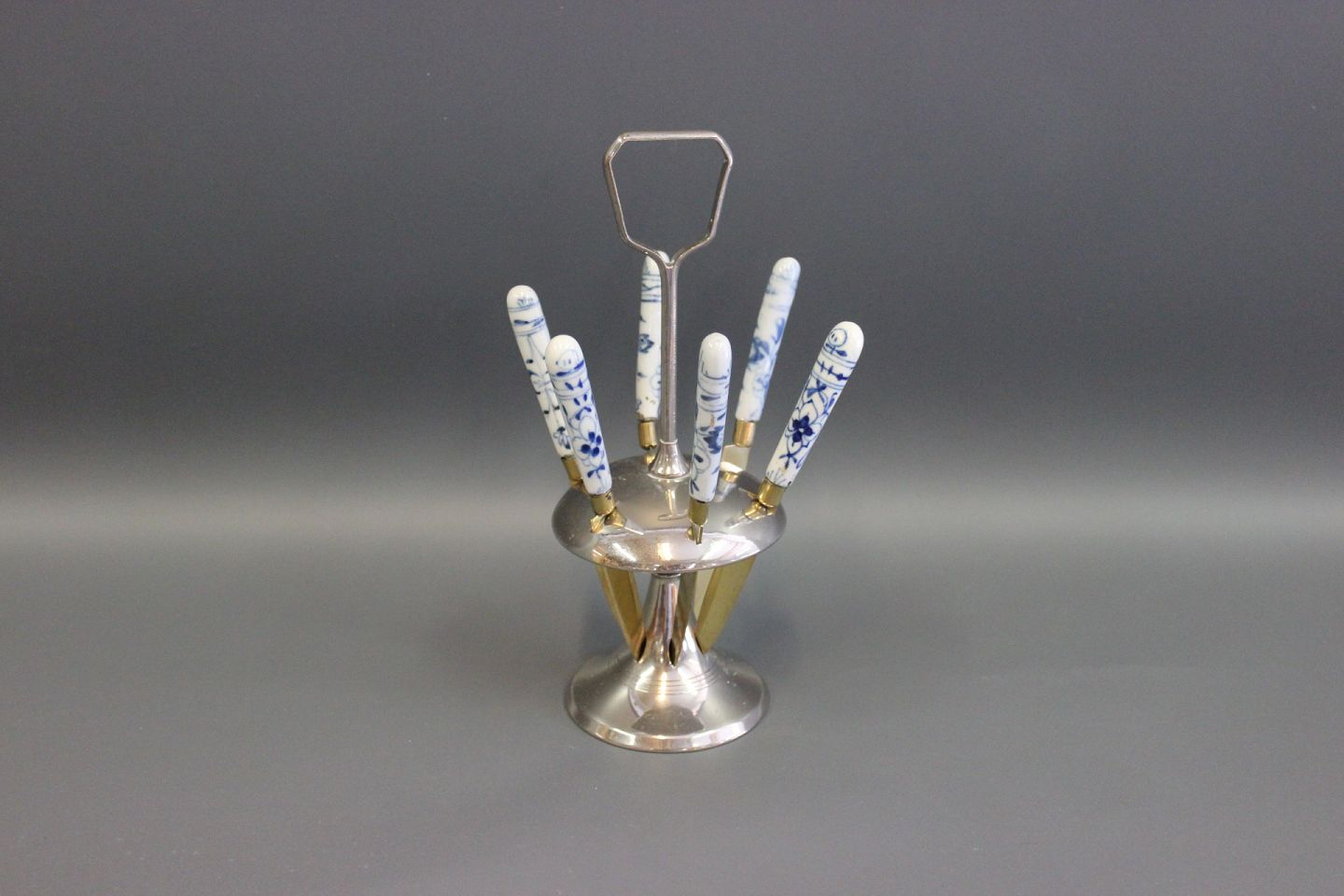Forsølvet knivholder med 6 stk. messing frugtknive i løgmønstret.