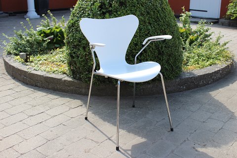 Solgt4 hvide syver stole, model 3107, med armlæn, designet af Arne Jacobsen og produceret af Fritz Hansen. Stolene er produceret i 2008, men designet i 1950erne.