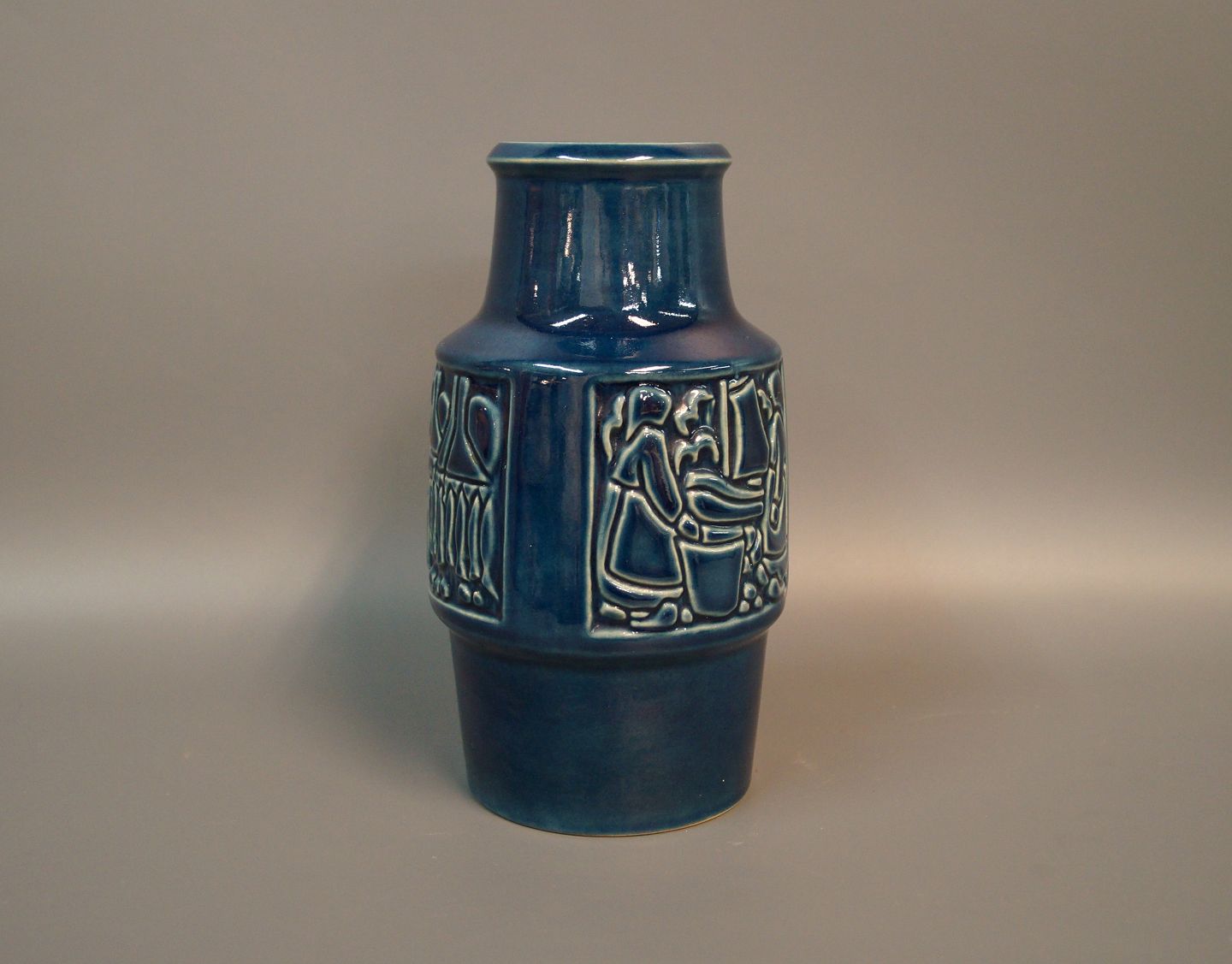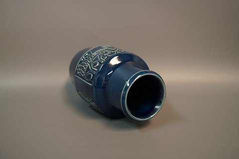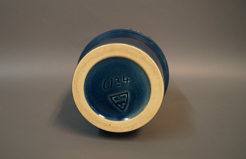 Ceramic vase with blue glaze and motif on the sides by Michael Andersen and son, no. 6134.