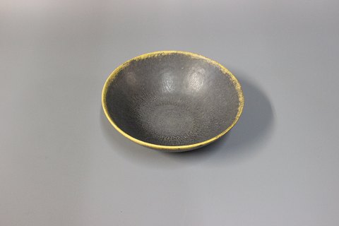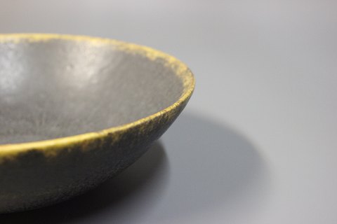 SolgtBrun stentøjsskål med gul kant signeret Eigil Henriksen, Danmark.
