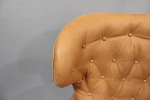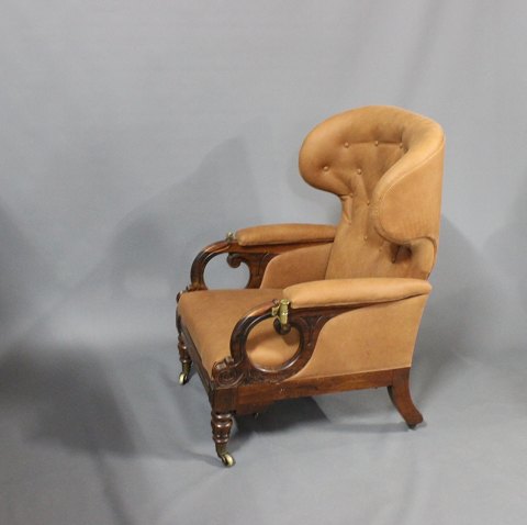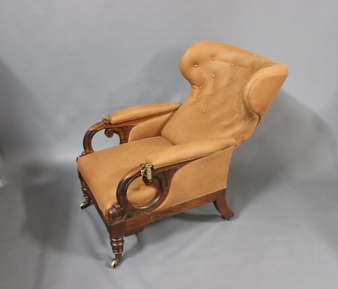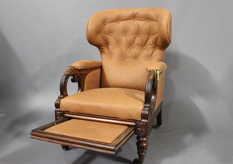 SolgtWilliam IV åben lænestol i palisander og læder med ryg som kan lægges ned og skydebar fodskammel af George Minter. Stolen er fra England og fra omkring 1830erne. Stolen kan lænes endnu mere tilbage.