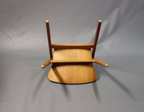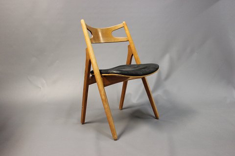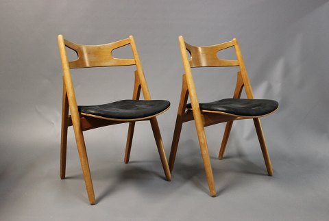 SoldA pair of "Sawbench" dining room chairs in polished beech and suede, model CH29. The chairs were designed by Hans J. Wegner in 1952 and manufactured by Carl Hansen & Son.