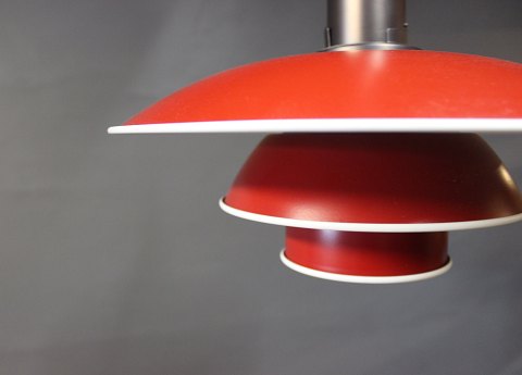 SoldPH3½-3 pendant with red lacquered metal Shades with a White edge and mounting in copper. The pendant was launched in occasion of Poul Henningsen's 120th birthday. The pendant is designed from Poul Henningsen's designs from the early 1920s - late 30s and manufactured by Louis Poulsen.
