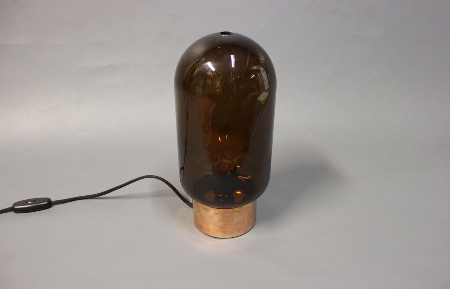 SoldRuben, Velvet, tablelamp designed by Niclas Hoflin in copper and Brown glass. The lamp is an exhibition model and has therefor never been used.