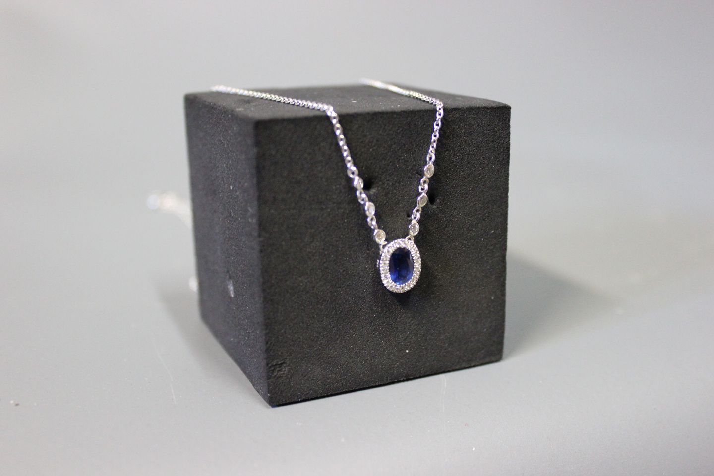 18 carat White gold neclace with 21 0,01 d., 6 0,03 d. and a saphire.