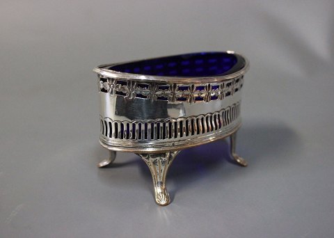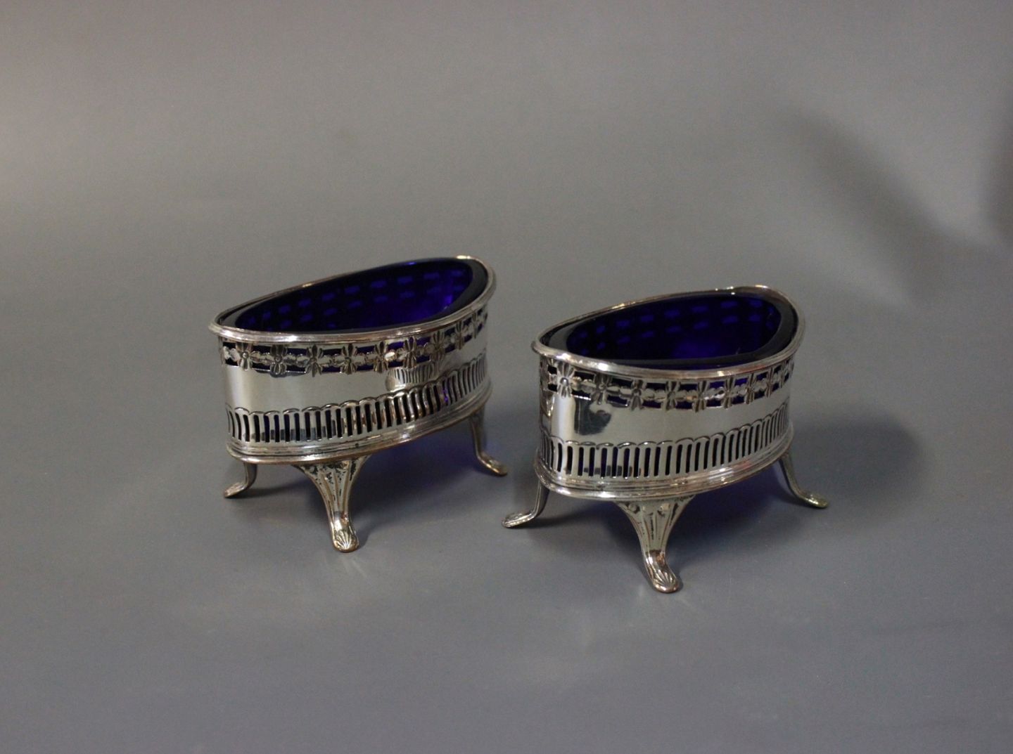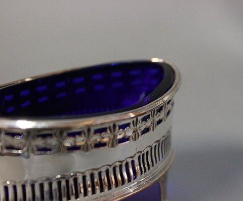 A set of salt bowls in silver plate and blue glass.