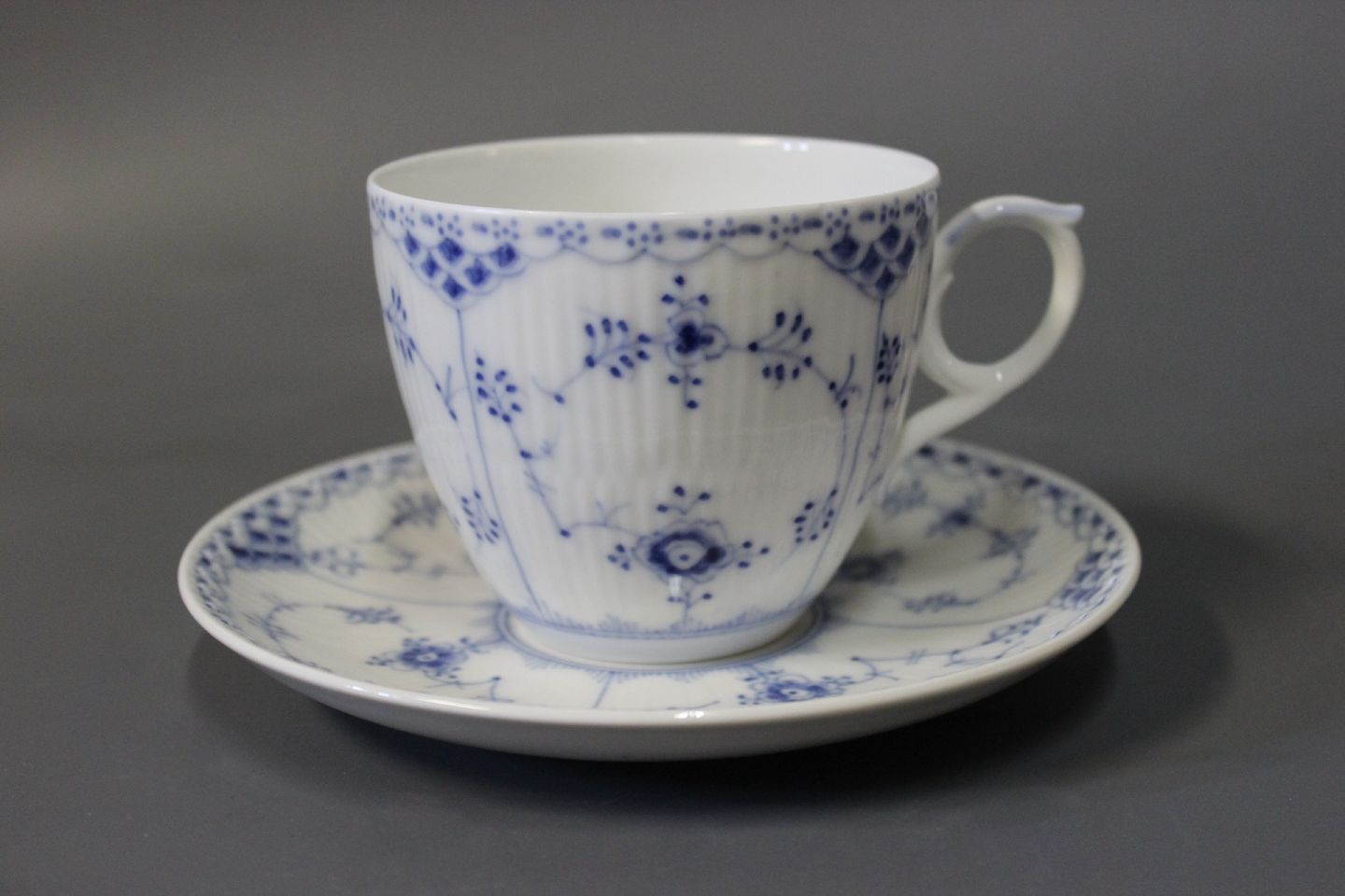 SoldRoyal Copenhagen blue fluted half lace cocoacup with saucer, no.: 1/703.