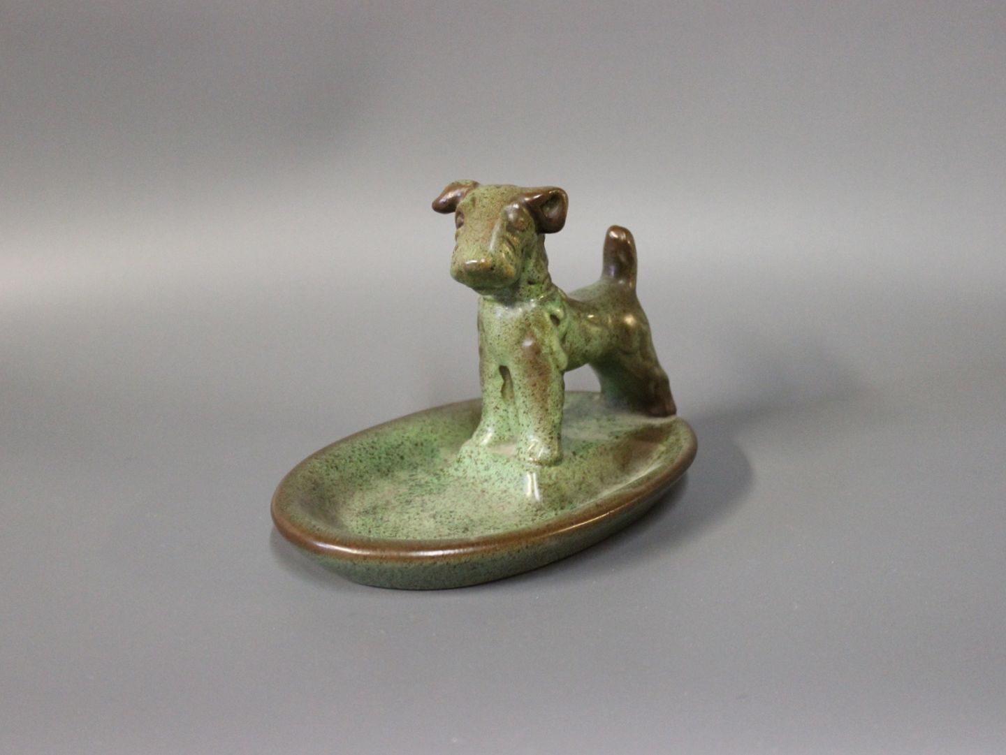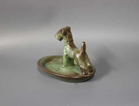 SoldSmall ceramic dish with a dog figurine in Brown and green colors by Michael Andersen & Son.