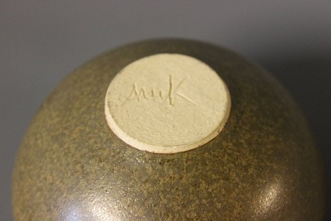 Lille keramik skål i grønne og brune farver, stemplet Ann K.