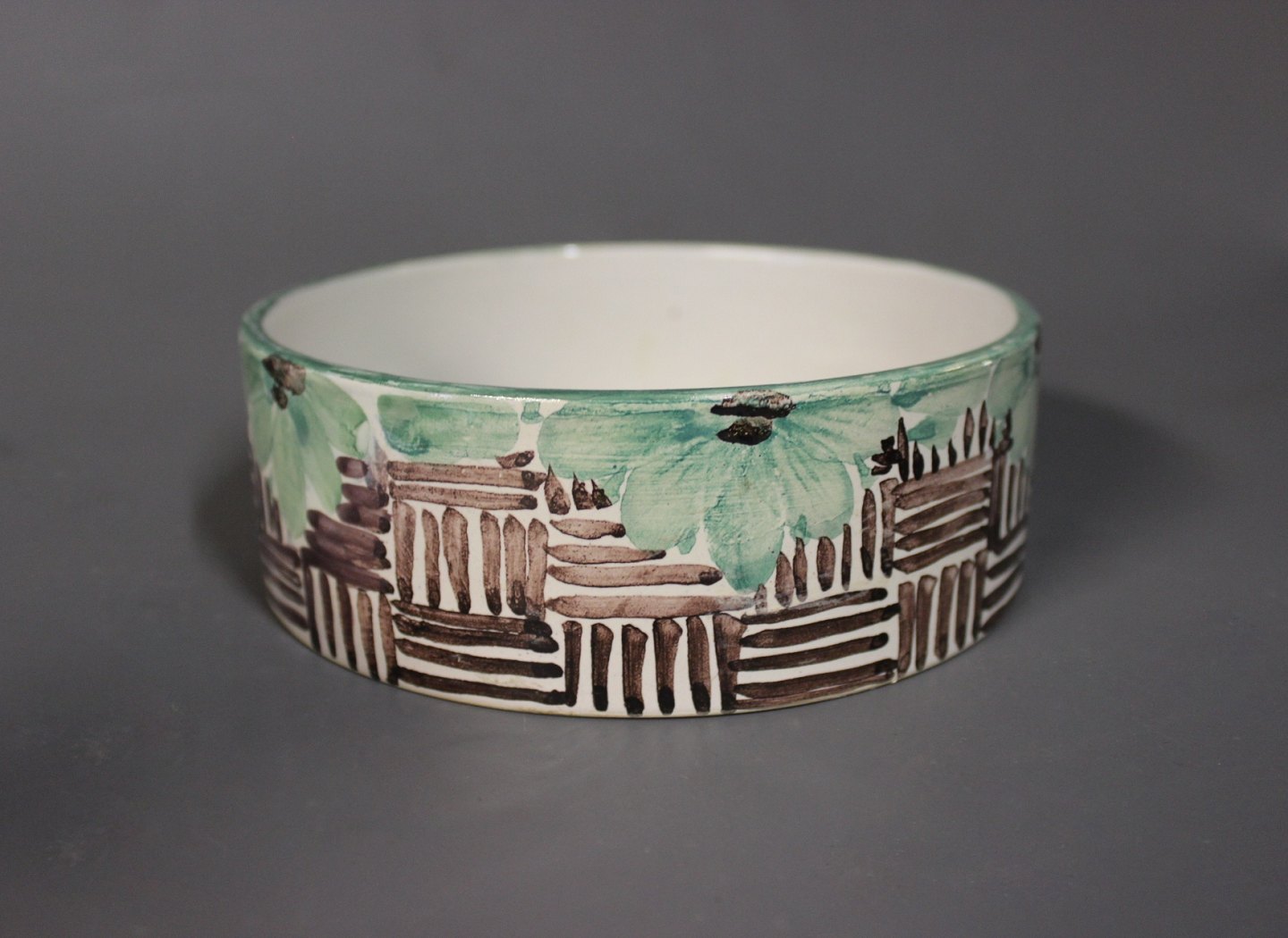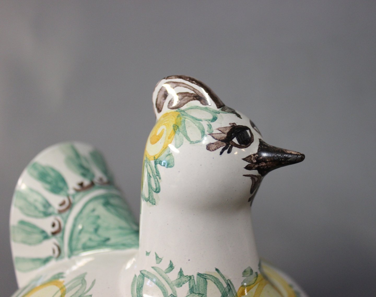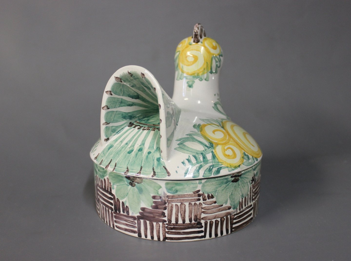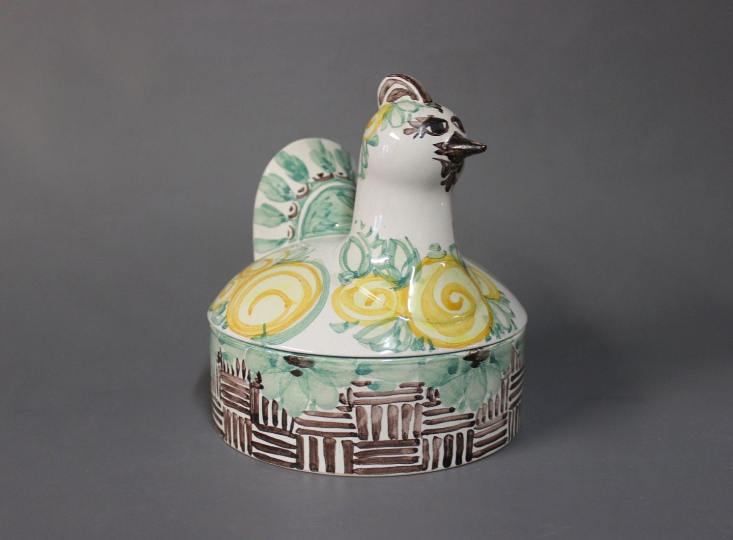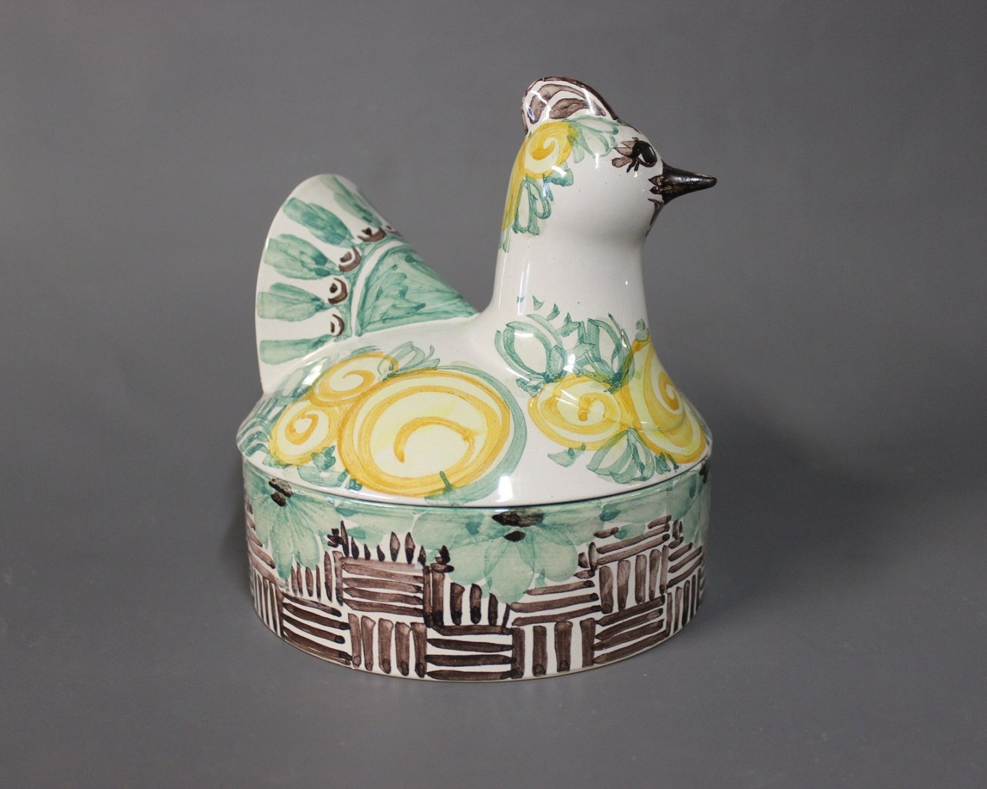 Lidded jar in the shape of a hen by Bjørn Wiinblad, model M34 from 1984. The bowl is decorated in green, yellow, Brown and White glaze.