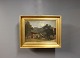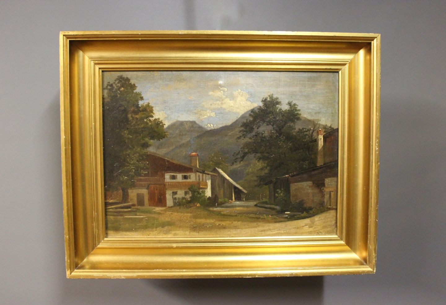 Oil painting of house in the Mountains signed A. Paul with wooden frame decorated with gold leaf.