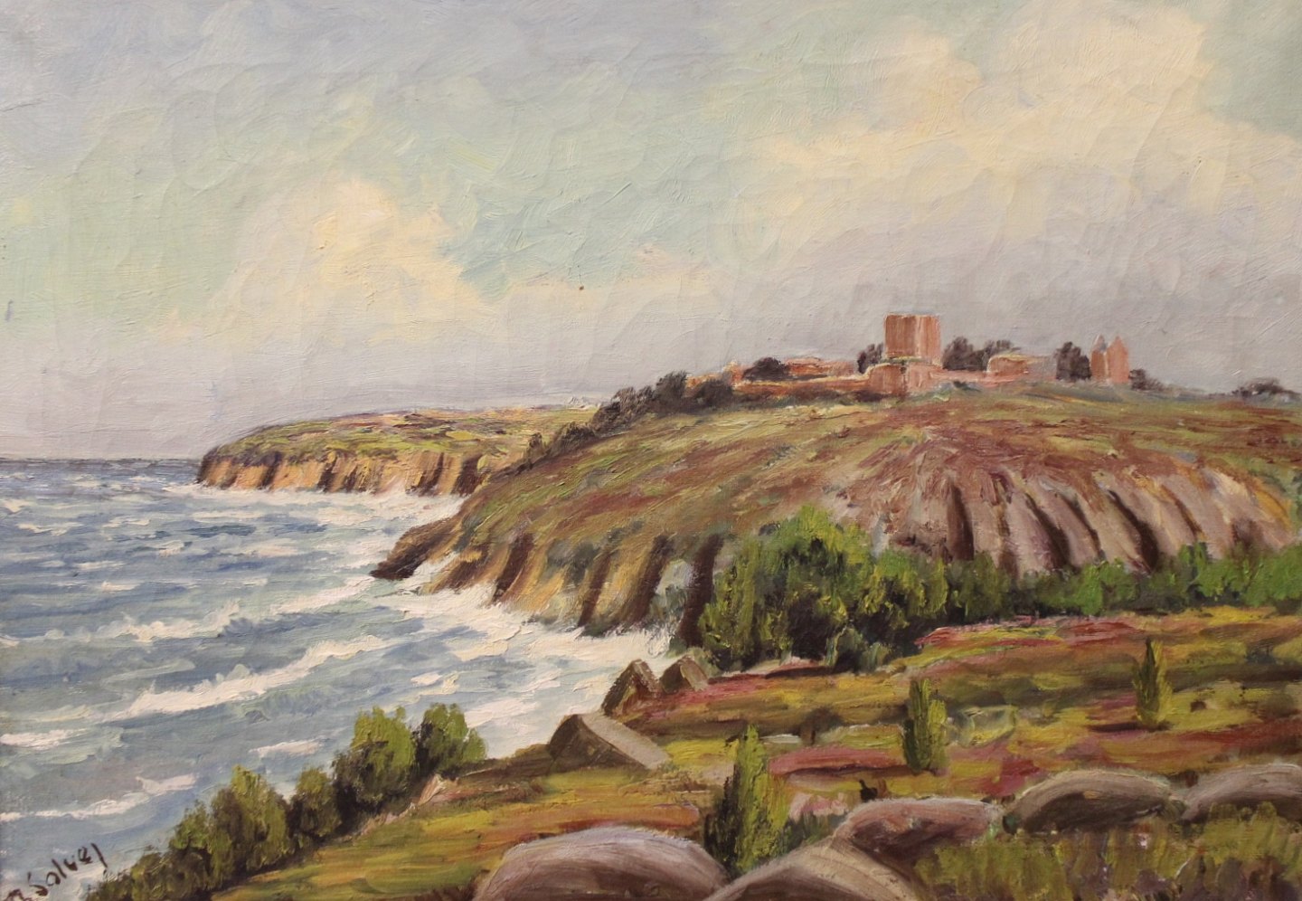Oliemaleri på lærred af kystlandskab signeret Solvej.
