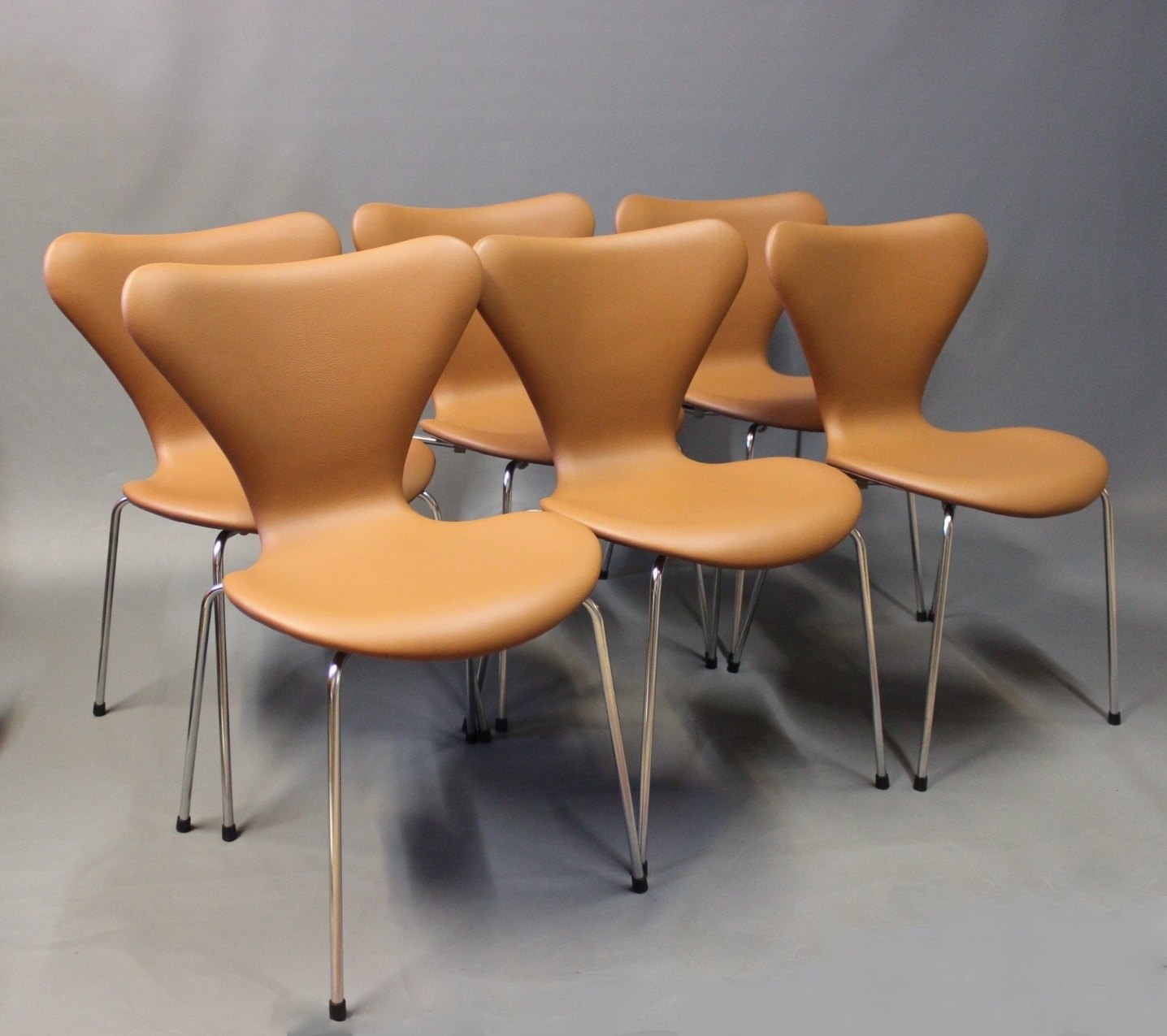 SoldA set of 6 Seven chairs, model 3107, designed by Arne Jacobsen and manufactured by Fritz Hansen. The chairs have recently been upholstered in Classic cognac colored leather.