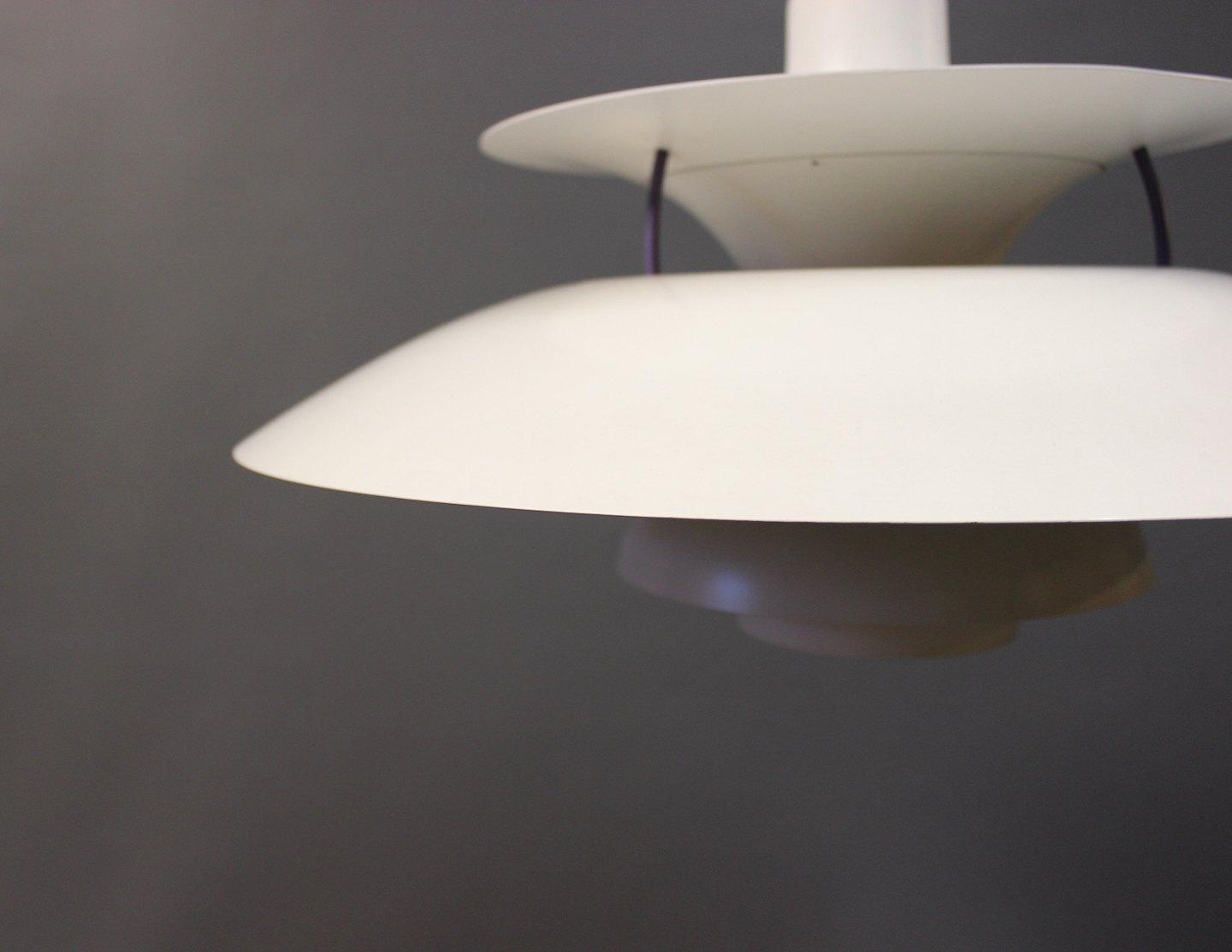 PH5 lamp designed by Poul Henningsen in 1958 and produced by Louis Poulsen. The lamp has white lacquered metal shades.