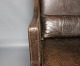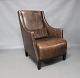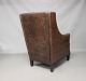 A pair of easy chairs in dark Brown leather with stools from the Italian brand Smania.