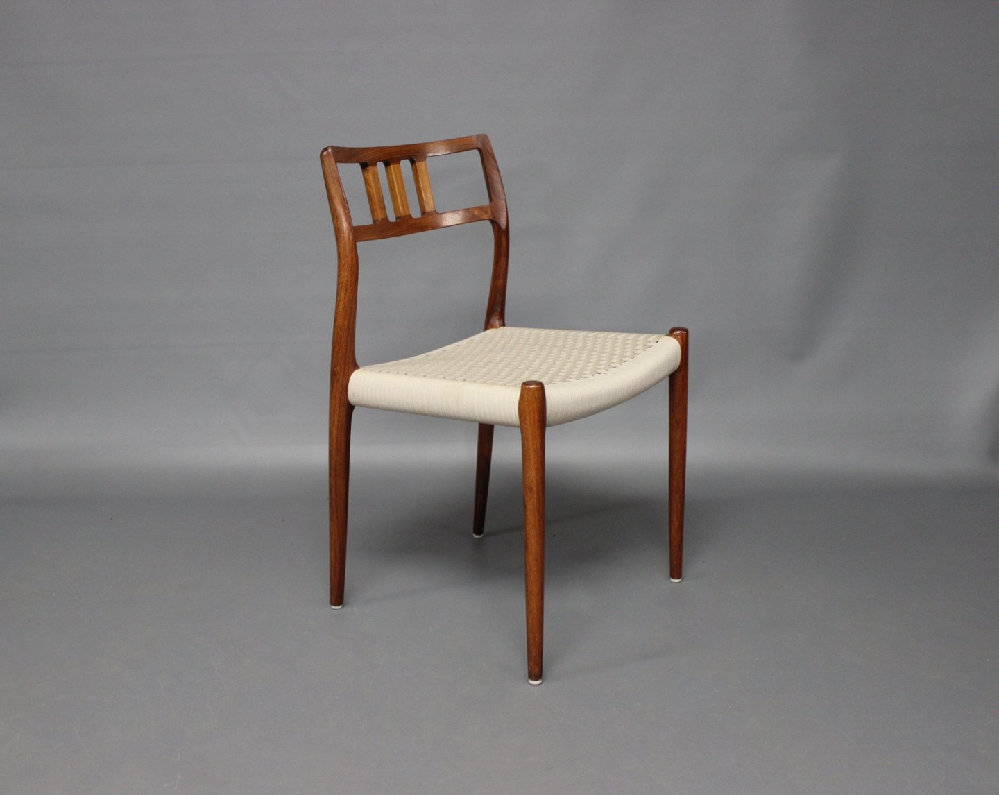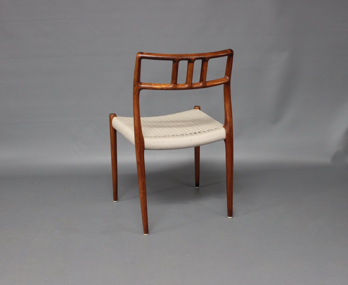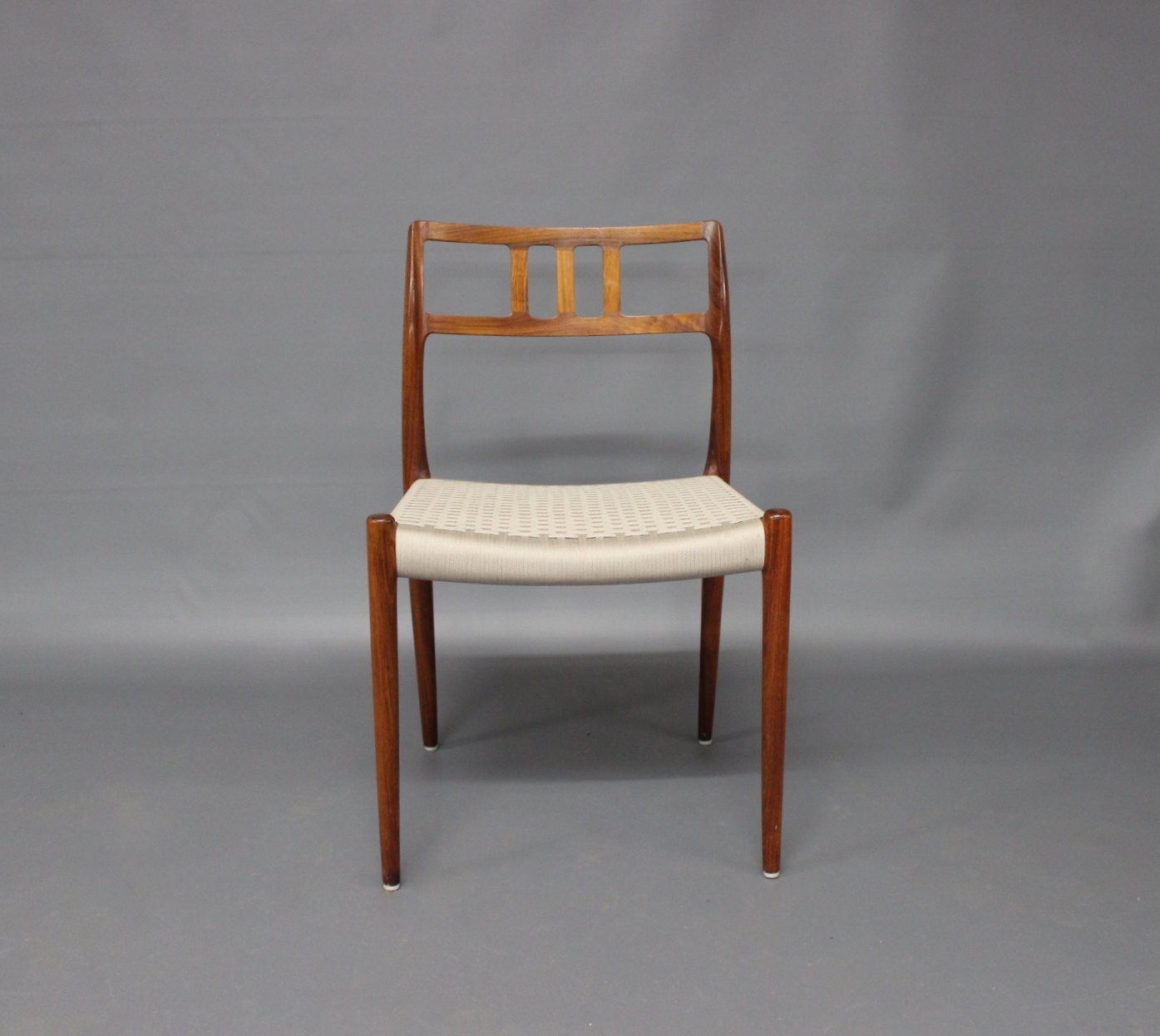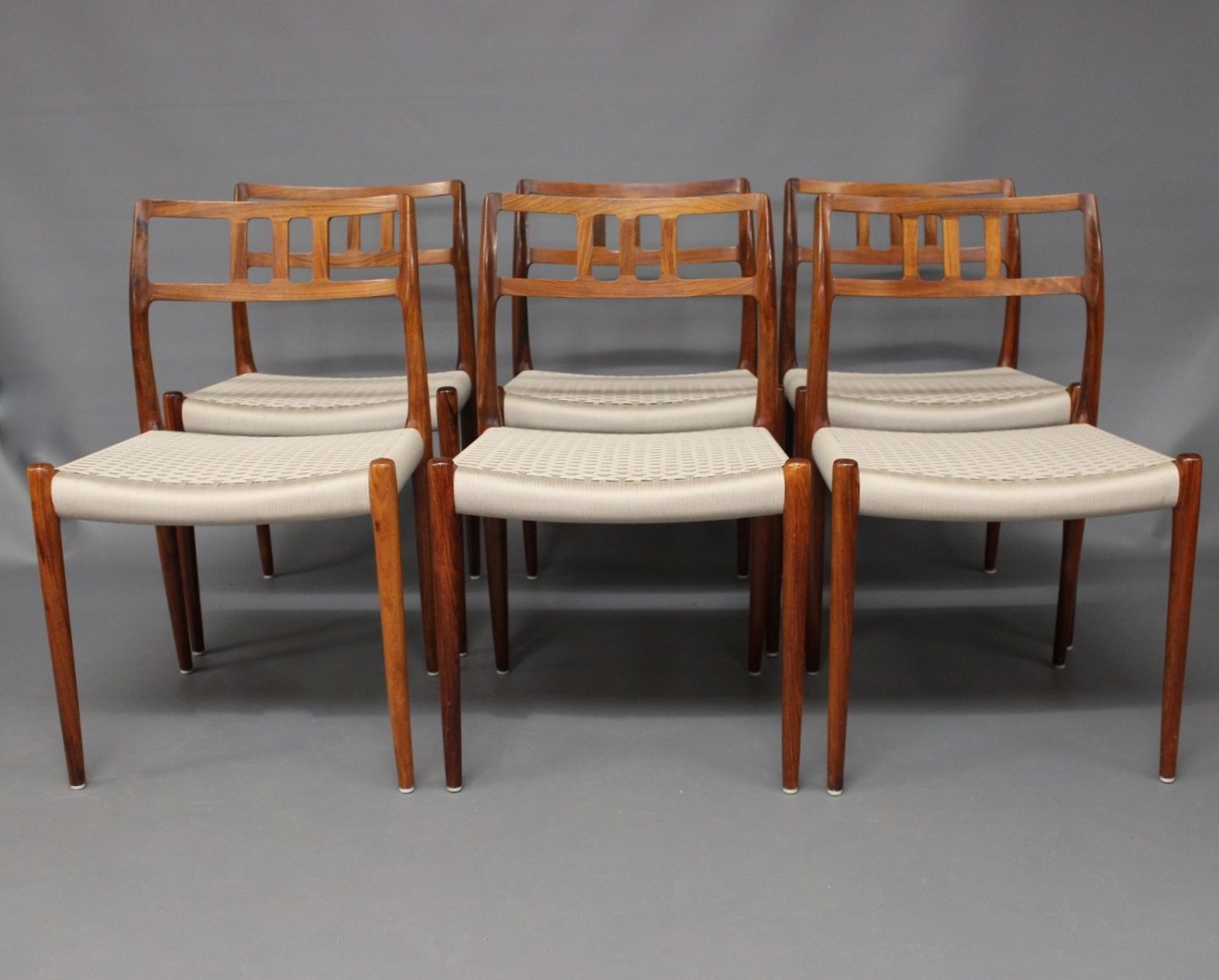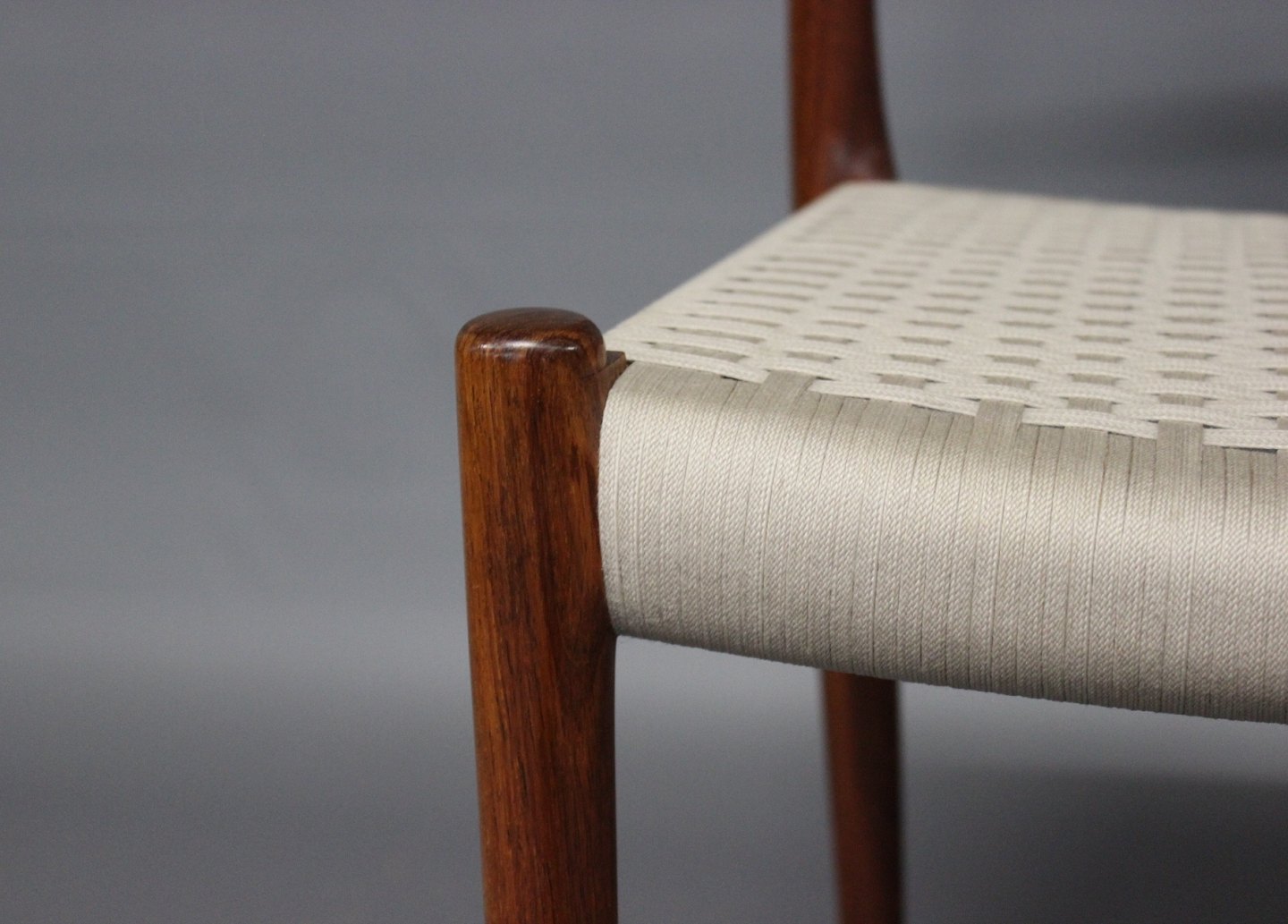 SoldA set of six dining room chairs, model 79, designed by N.O. Moeller in 1966 and manufactured by J.L. Moeller in the late 1960s. The chairs are made of rosewood and light grey seats.