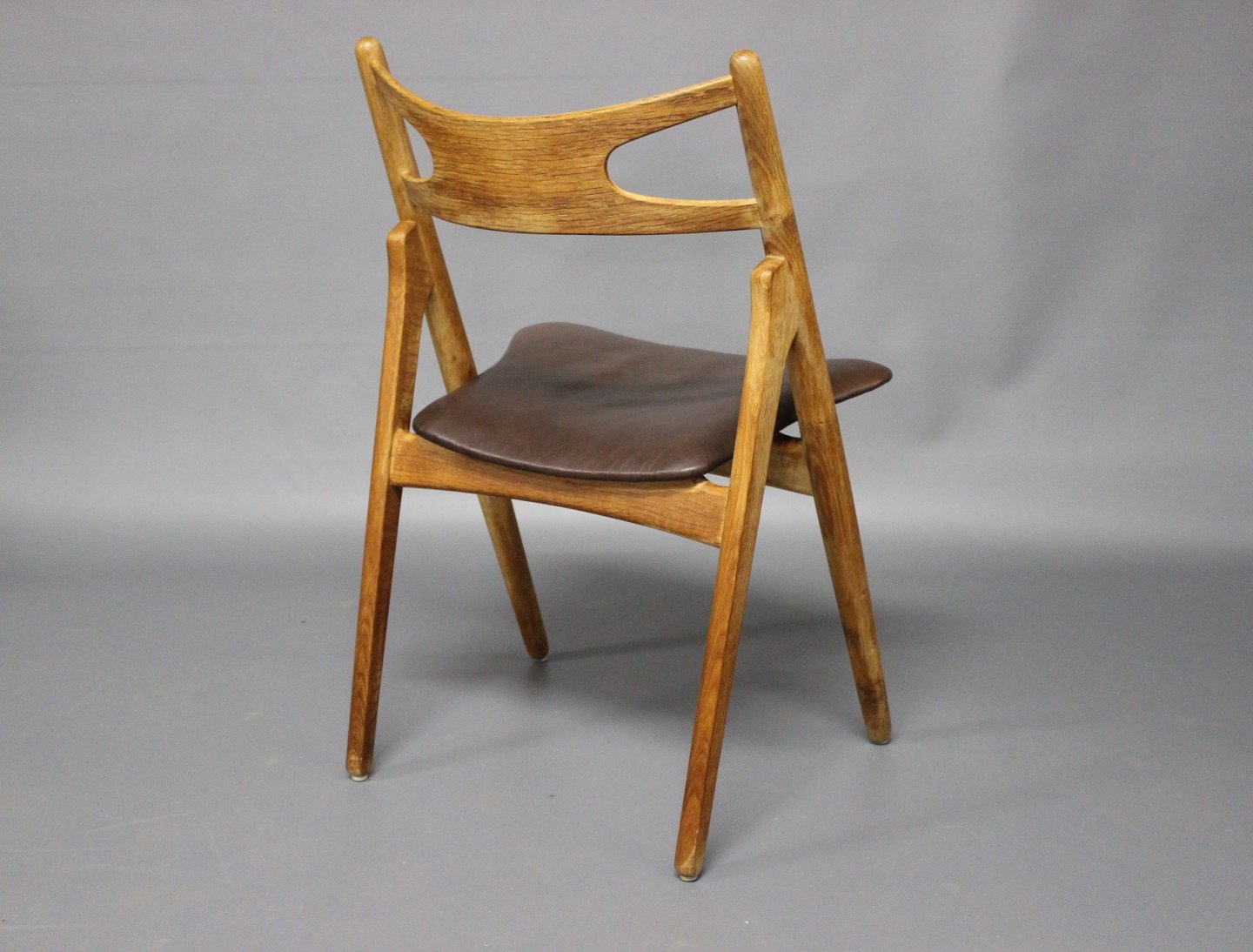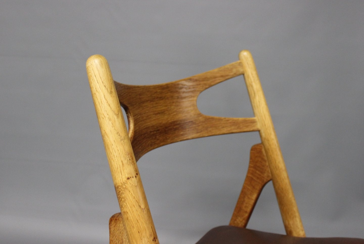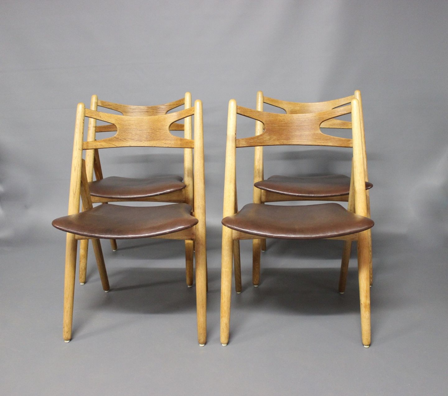 SoldA set of four Sawbuck chairs, model CH29, designed by Hans J. Wegner in 1952 and manufactured by Carl Hansen & Son in the 1960s. The chairs are made of oak and with seats of brown patinated leather.