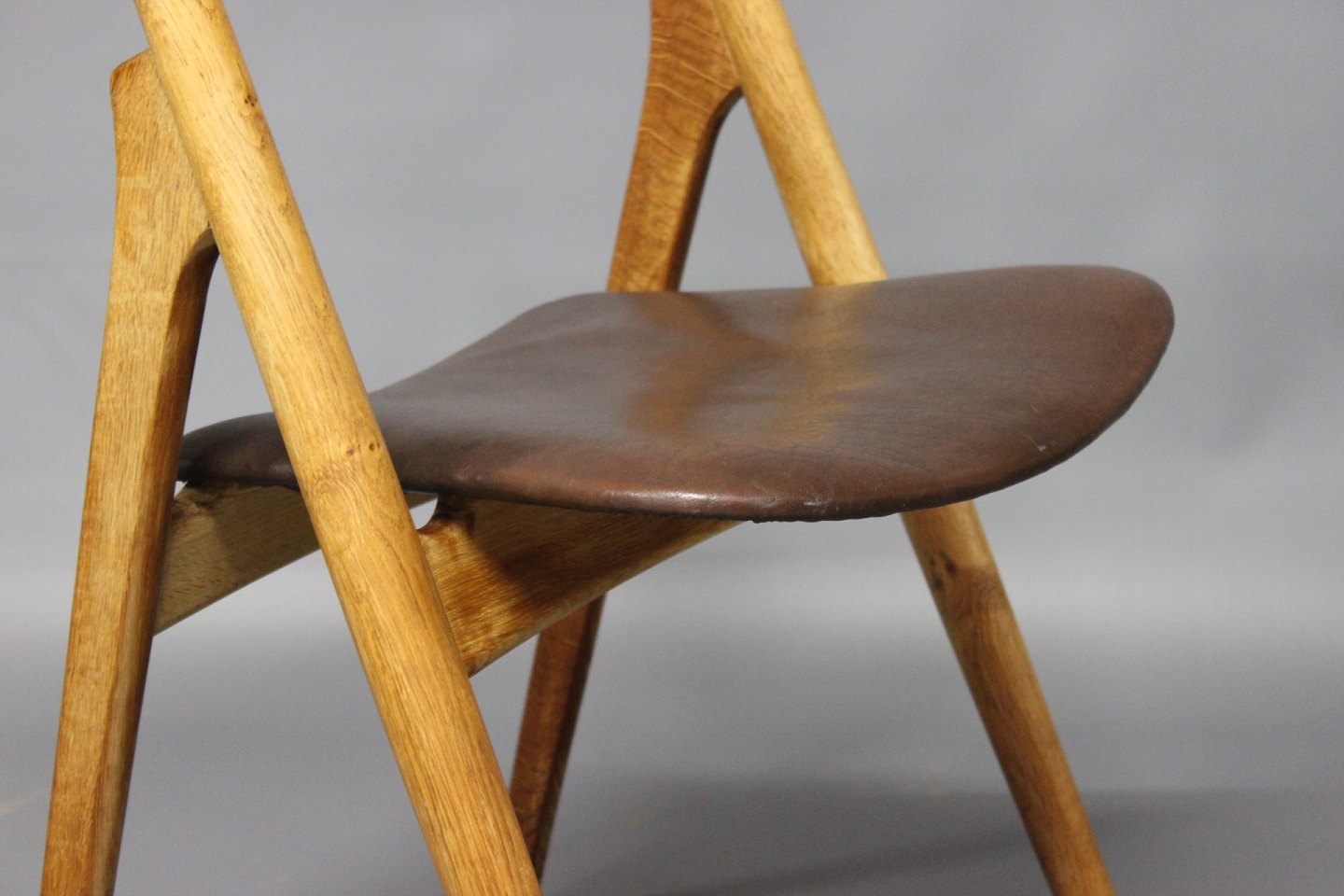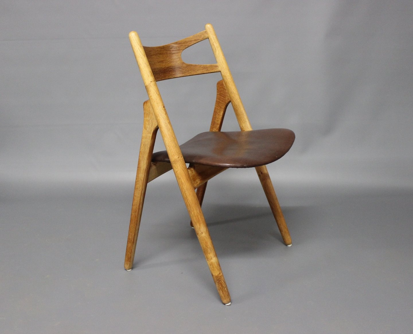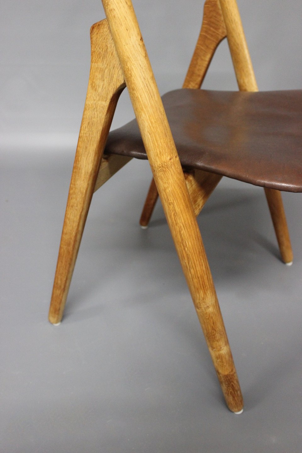 SoldA set of four Sawbuck chairs, model CH29, designed by Hans J. Wegner in 1952 and manufactured by Carl Hansen & Son in the 1960s. The chairs are made of oak and with seats of brown patinated leather.