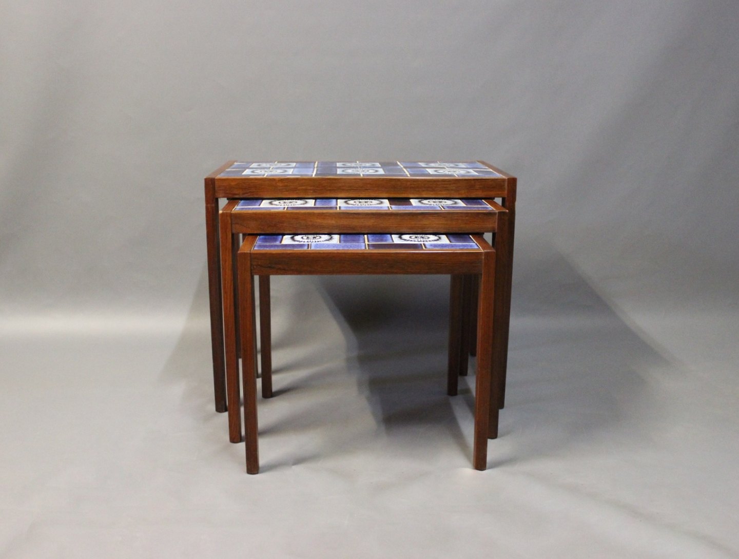 SoldA set of nesting tables in rosewood with tiles in blue colors, Danish Design from the 1960s.