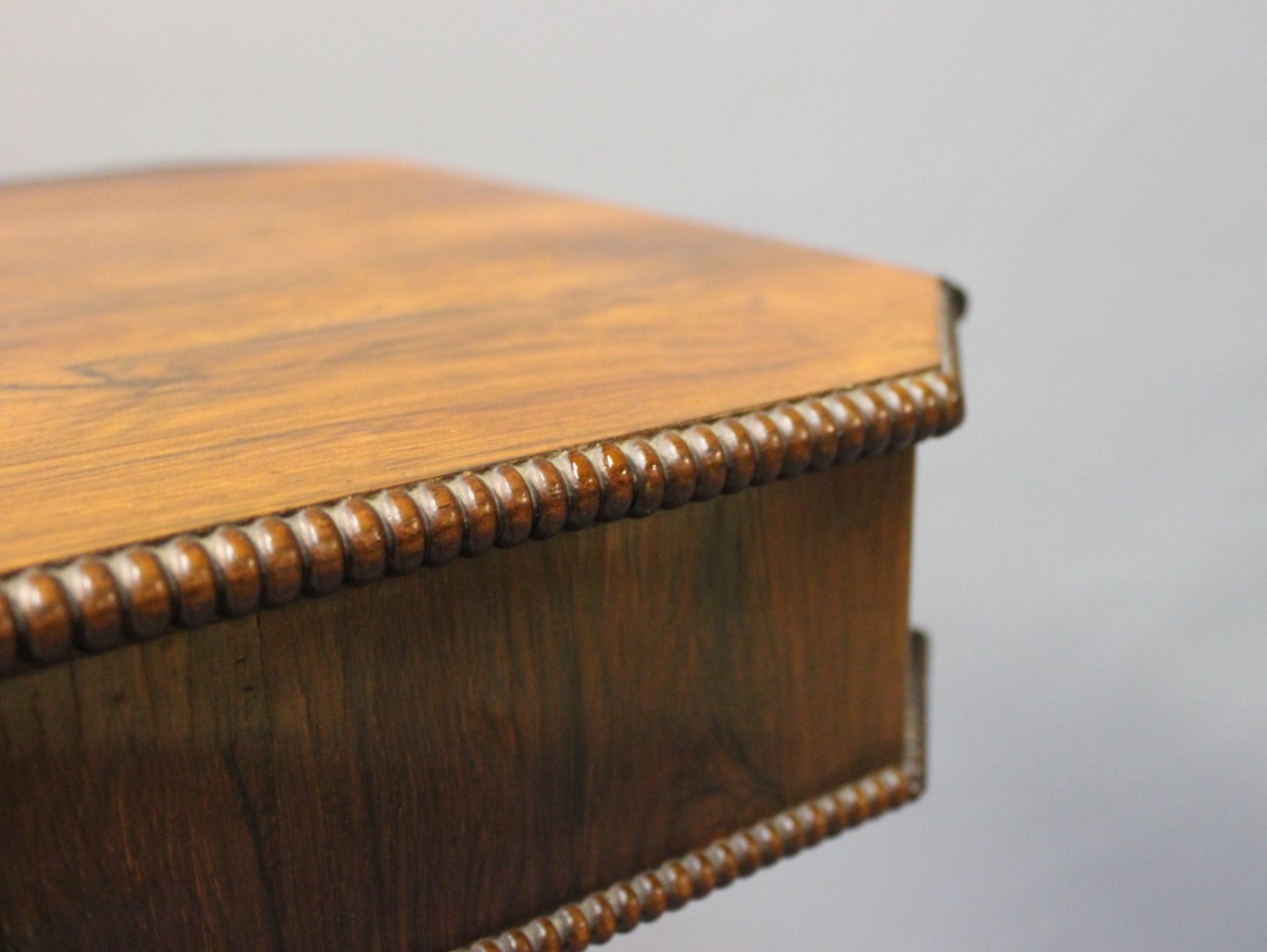 Lille antikt sybord i palisander med drejefunktion og fine detaljer. Bordet fremstår med en del patina og er fra mellem 1840 og 1860.