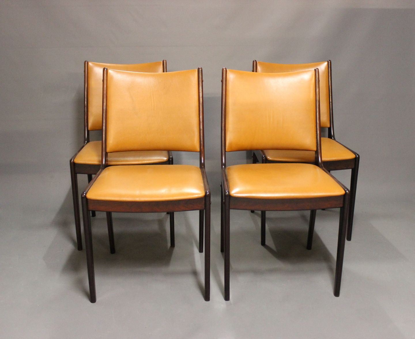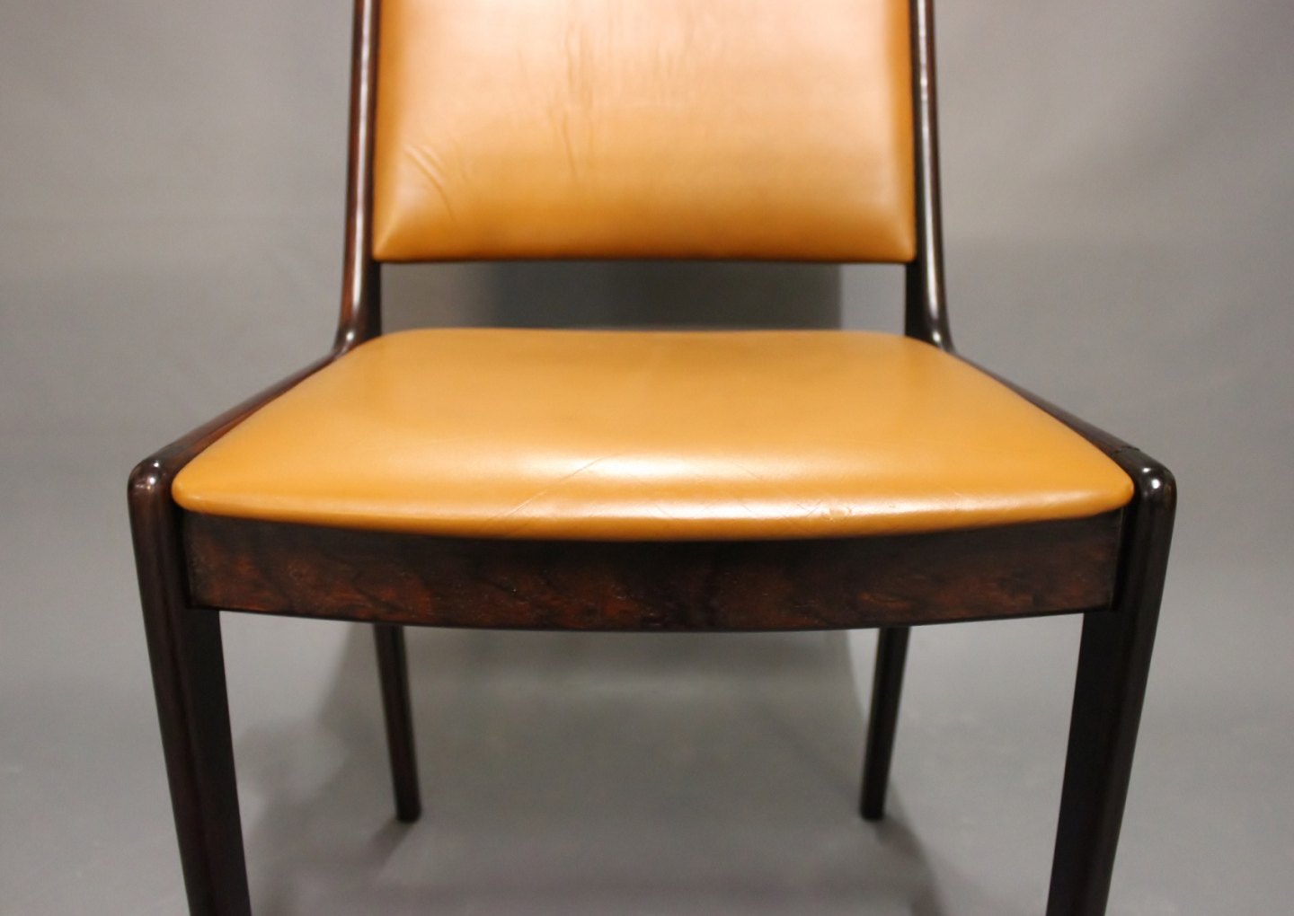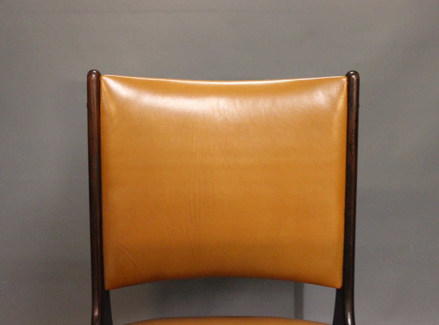 A set of 4 dining room chairs in polished mahogany and cognac colored leather, danish design from the 1960s.