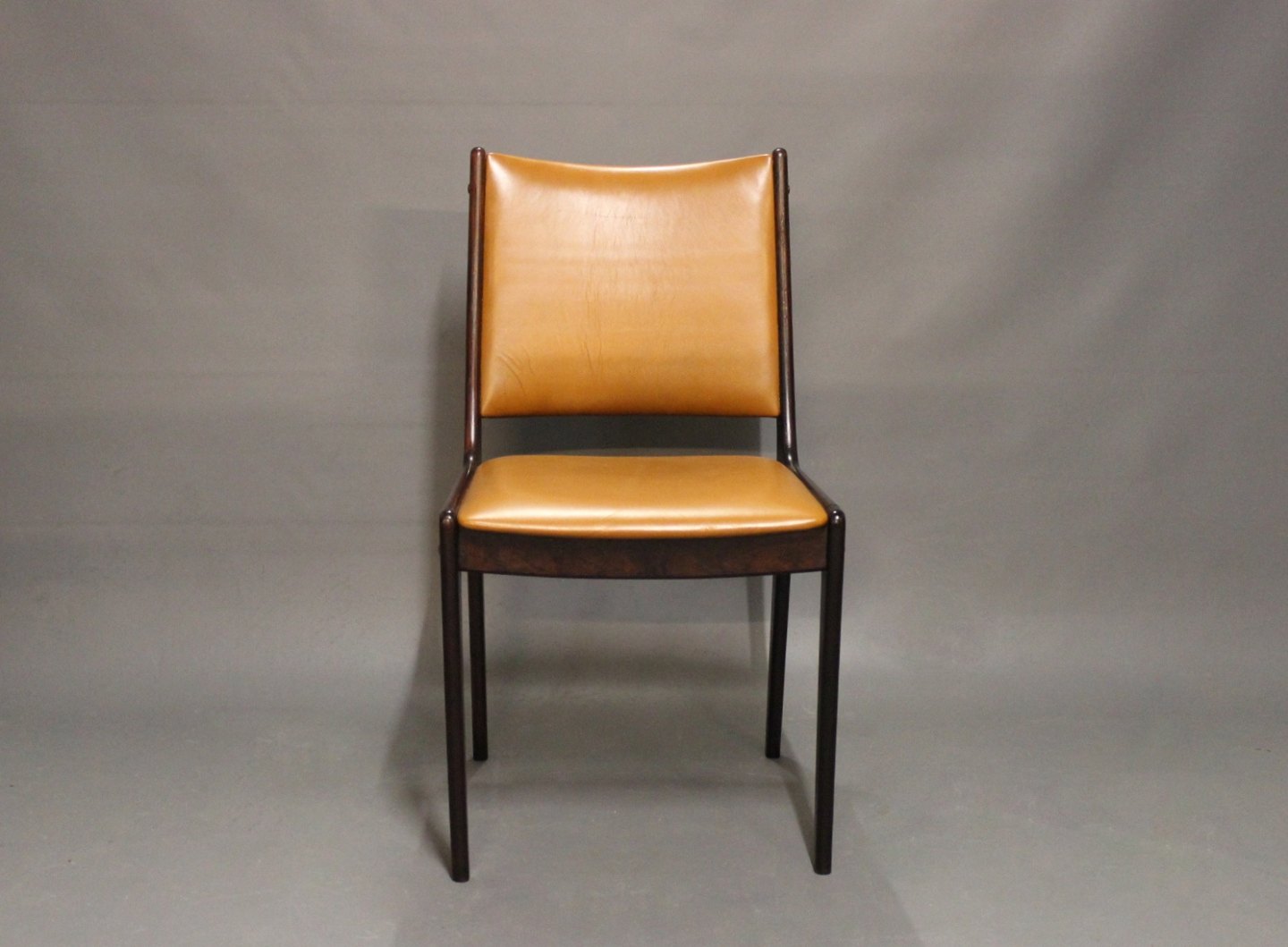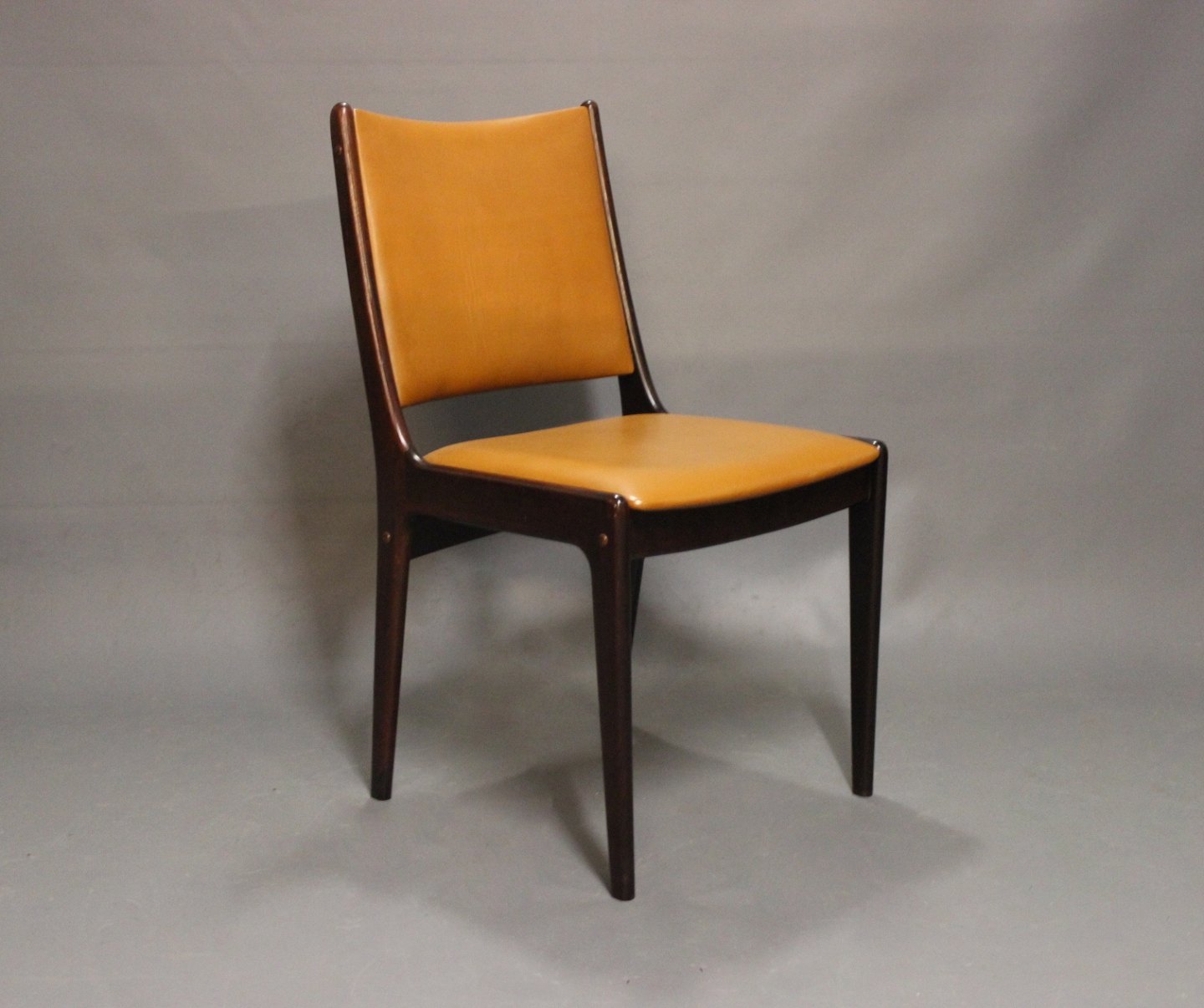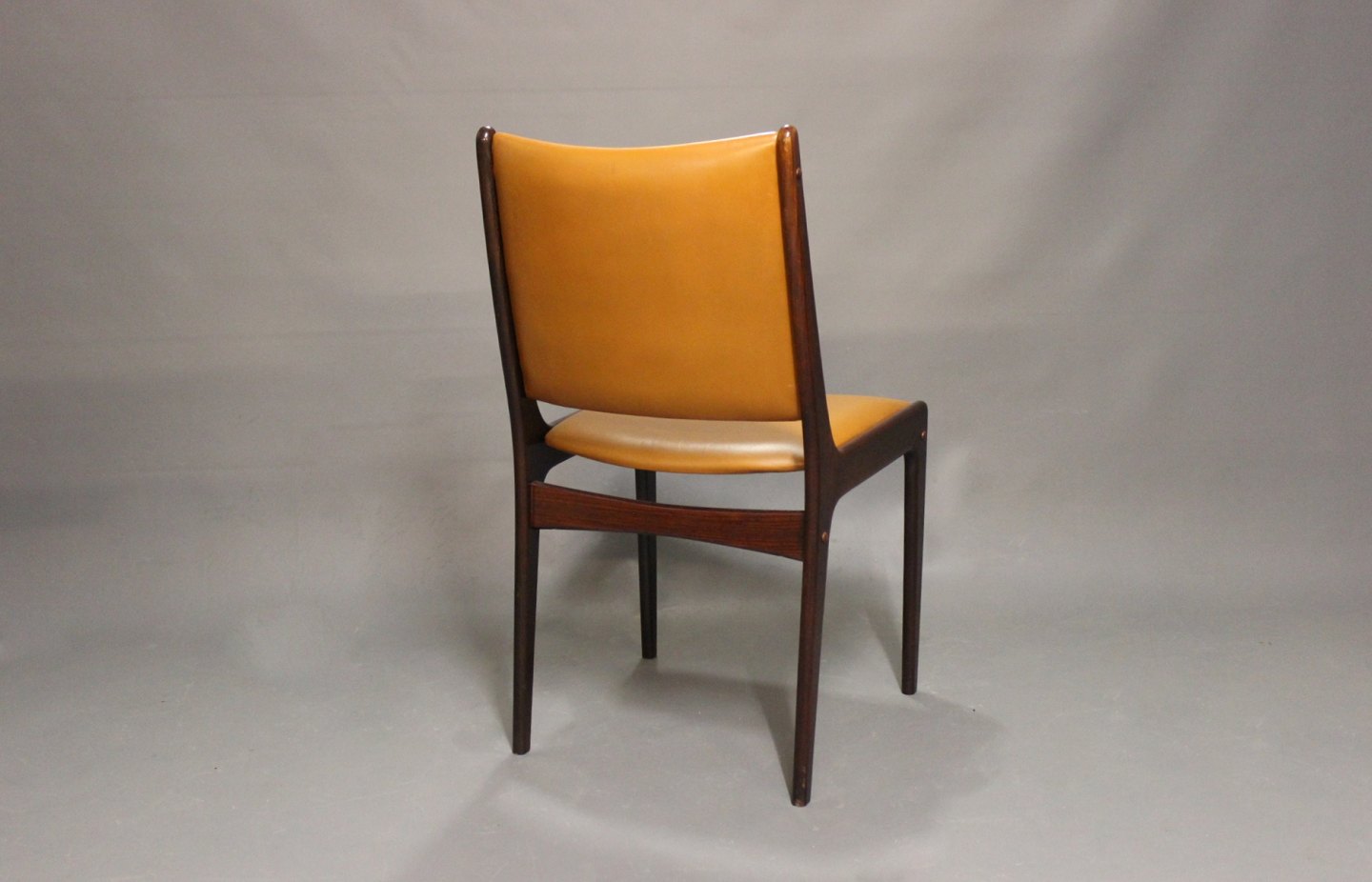 A set of 4 dining room chairs in polished mahogany and cognac colored leather, danish design from the 1960s.