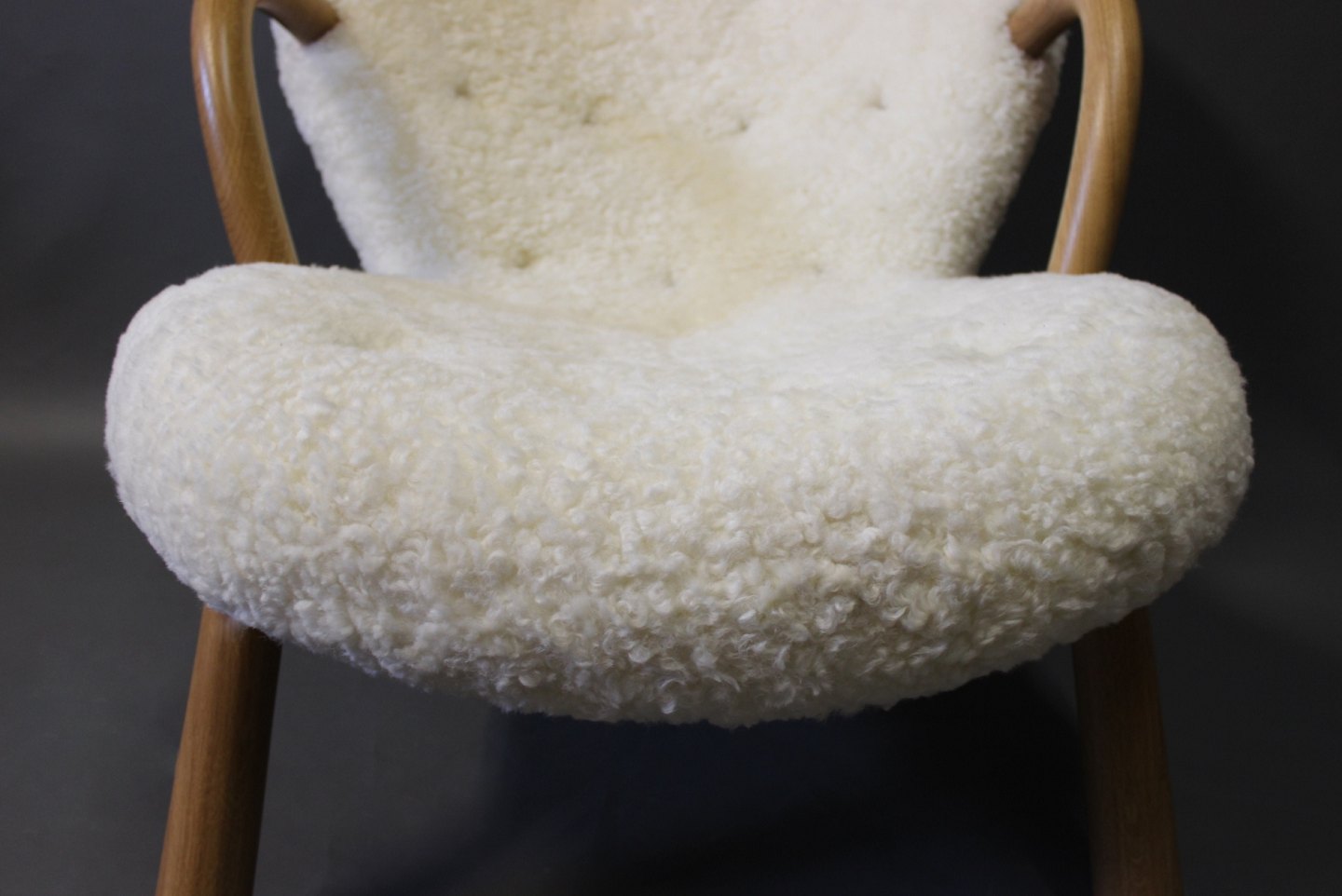 Sold"The Clam Chair" originally designed by Phillip Arctander in 1944 and manufactured by Paustian in 2016. The chair is upholstered in sheep skin and with amrs and legs og oak.