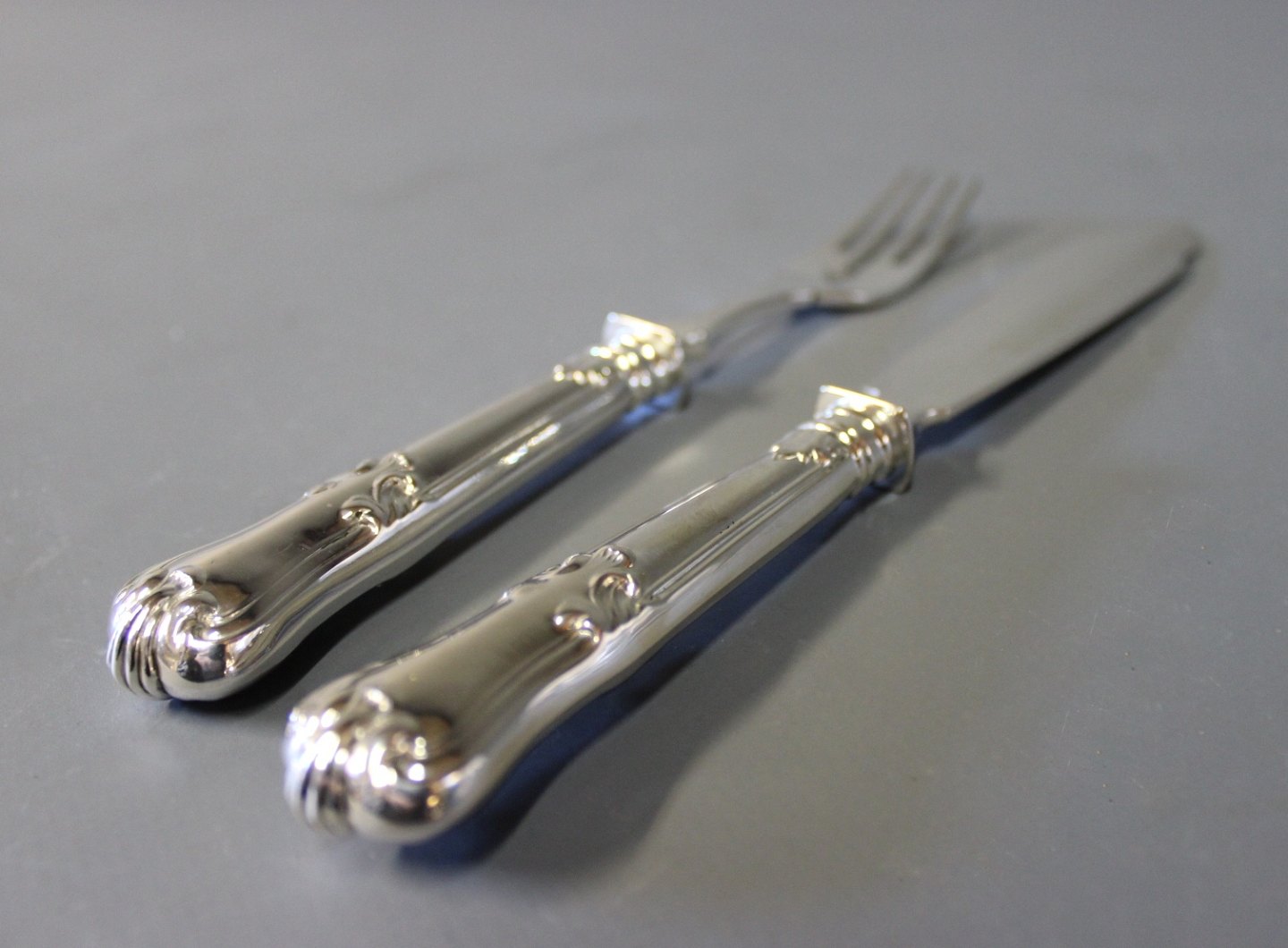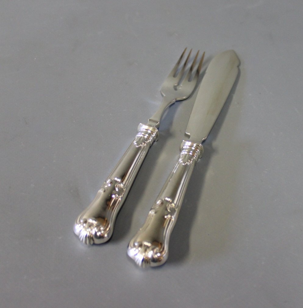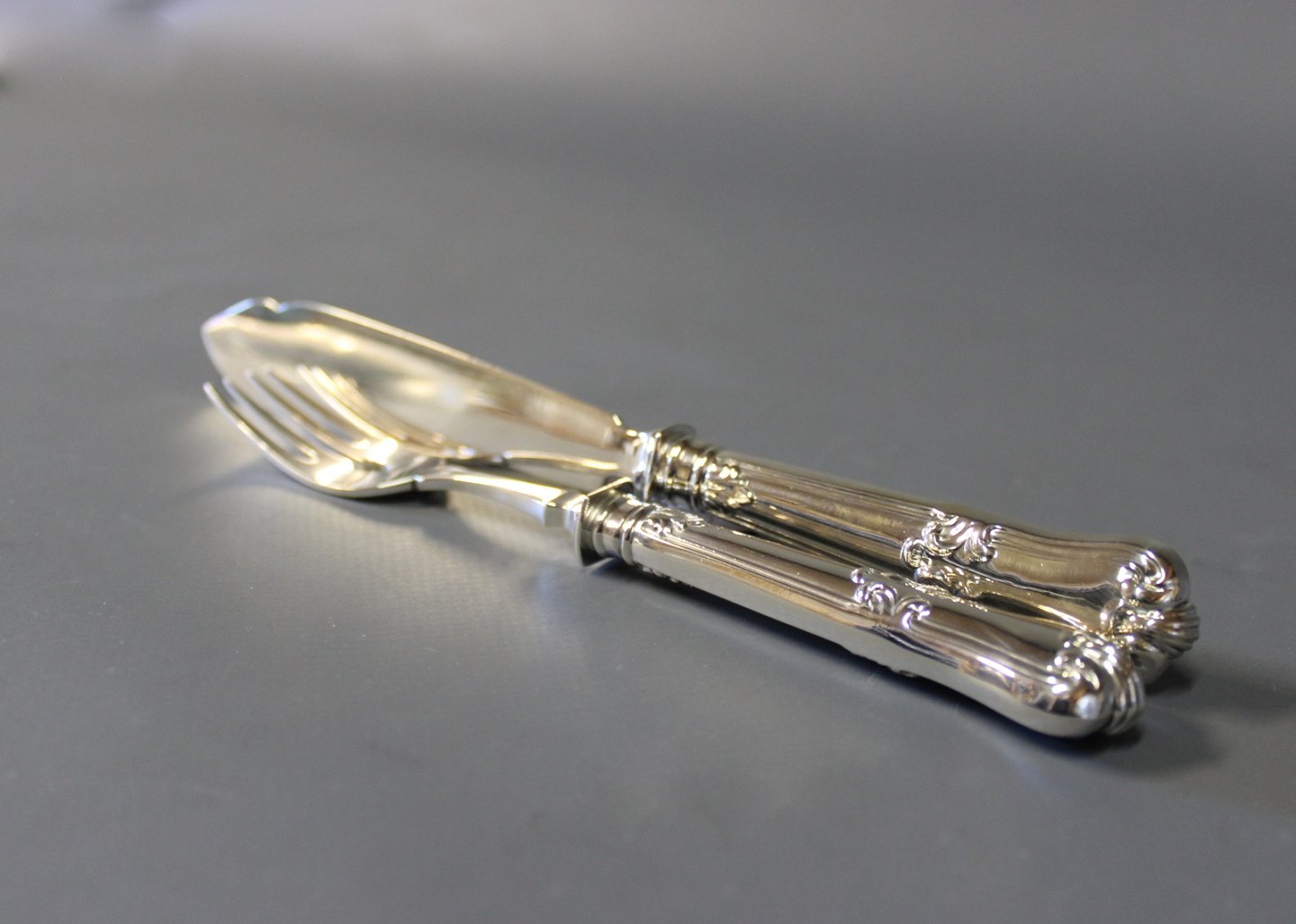 A set of fish cutlery consisting of a knife and fork, hallmarked silver. Ask for number in stock.