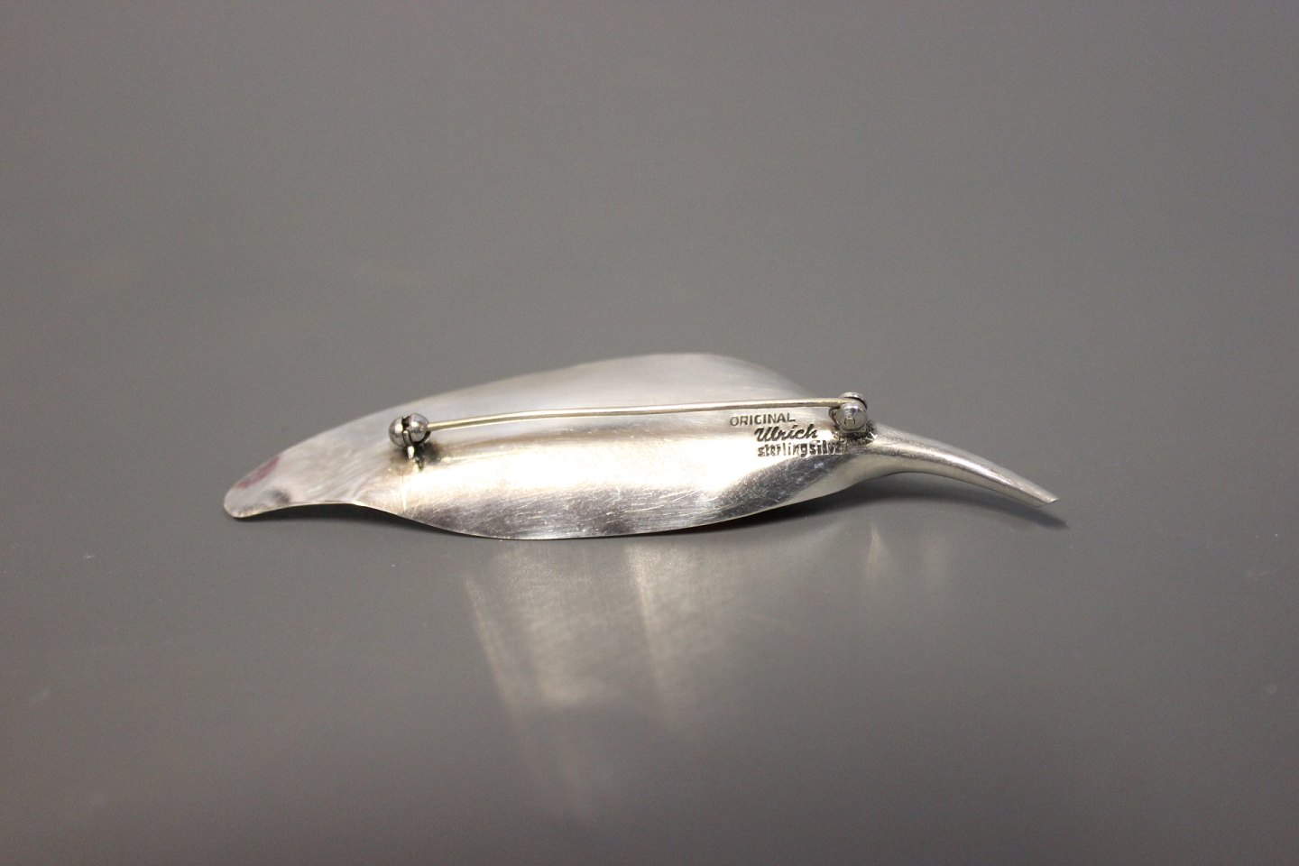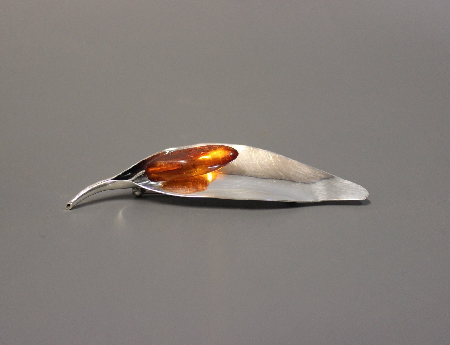 SoldBrooch shaped as a leaf with a piece opf amber stamped Original Ulrich in 925 sterling silver.