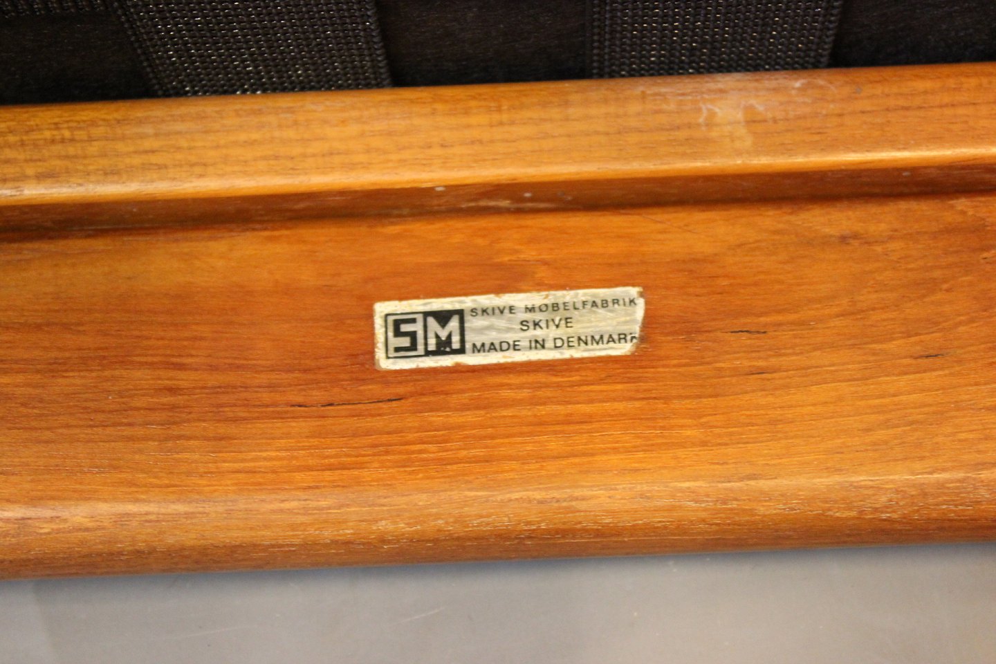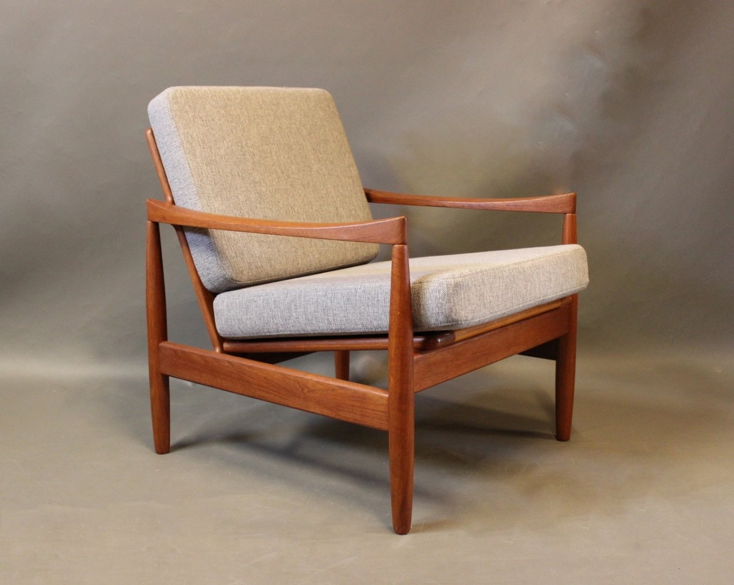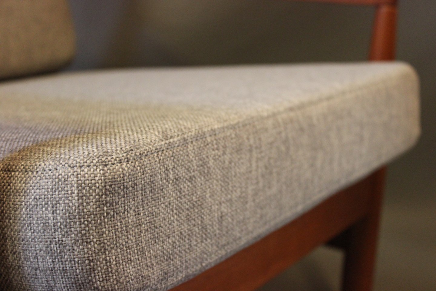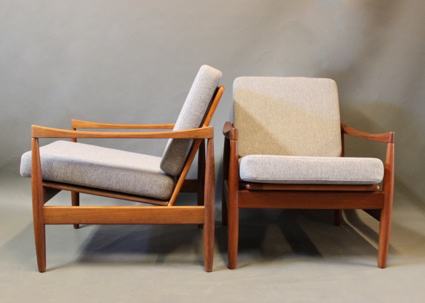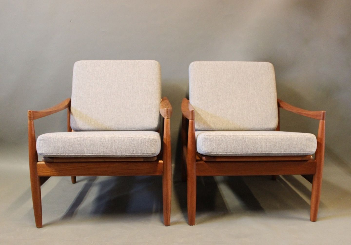 SolgtEt sæt lænestole i teak og hynder af lysegråt uld designet af Kai Kristiansen og fremstillet af Skive Møbelfabrik. Stolene er fra 1960erne og hynderne er nypolstret.