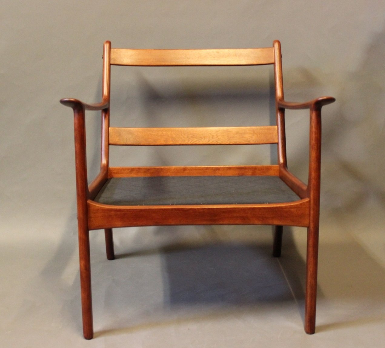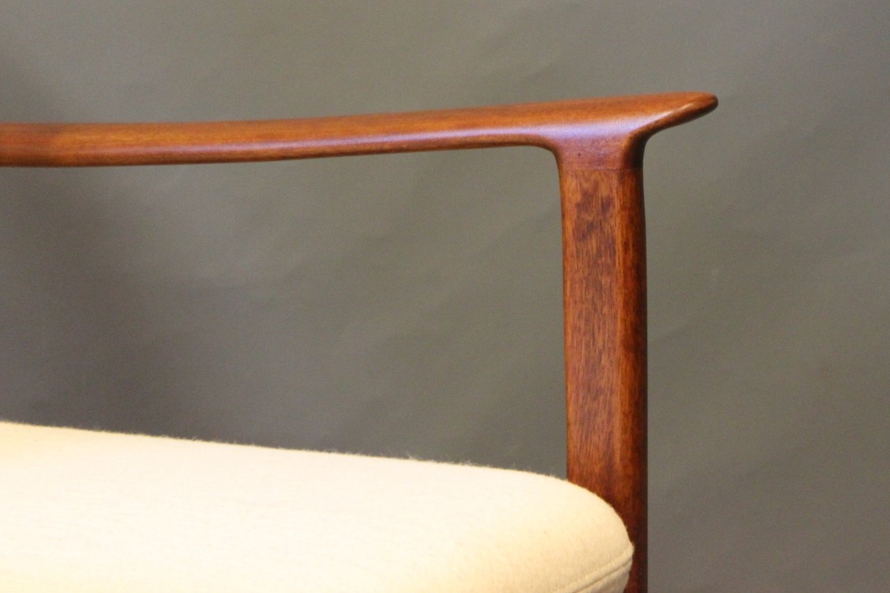 SoldPJ112 easy chair in polished mahogany and with cushions in light wool, designed by Ole Wanscher and manufactured by P. Jeppesen.