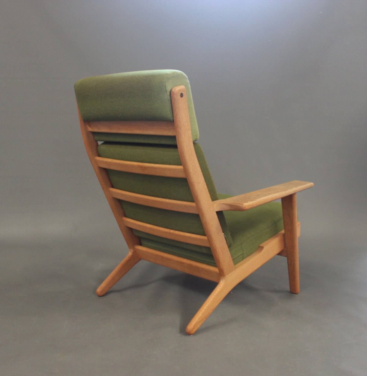 SoldA pair of armchairs with high backs, model GE290A, designed by Hans J. Wegner in the 1950s and manufactured by GETAMA in the 1960s. The chairs are made of oak and the cushions are of dark green upholstery. We have 1 left.