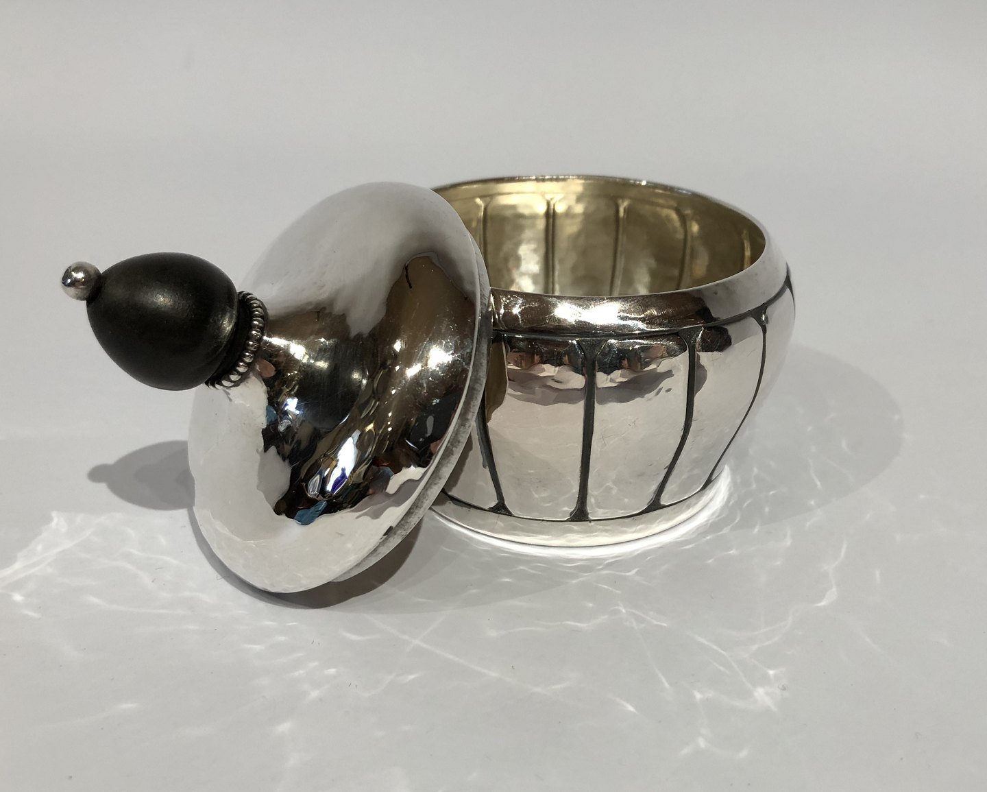 SoldSmall sugarbowl in hallmarked silver with pearl edge and ebony handle.