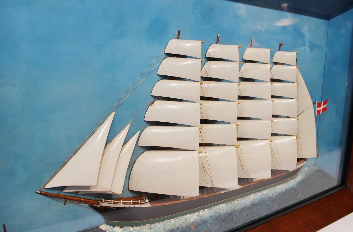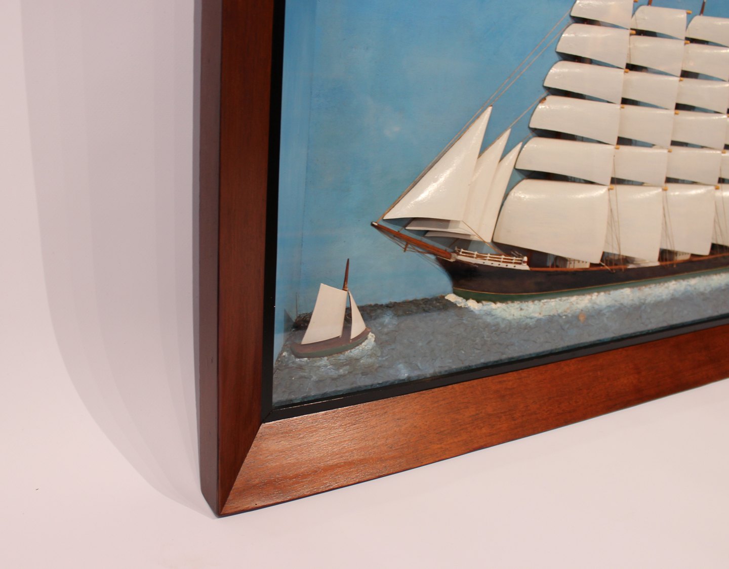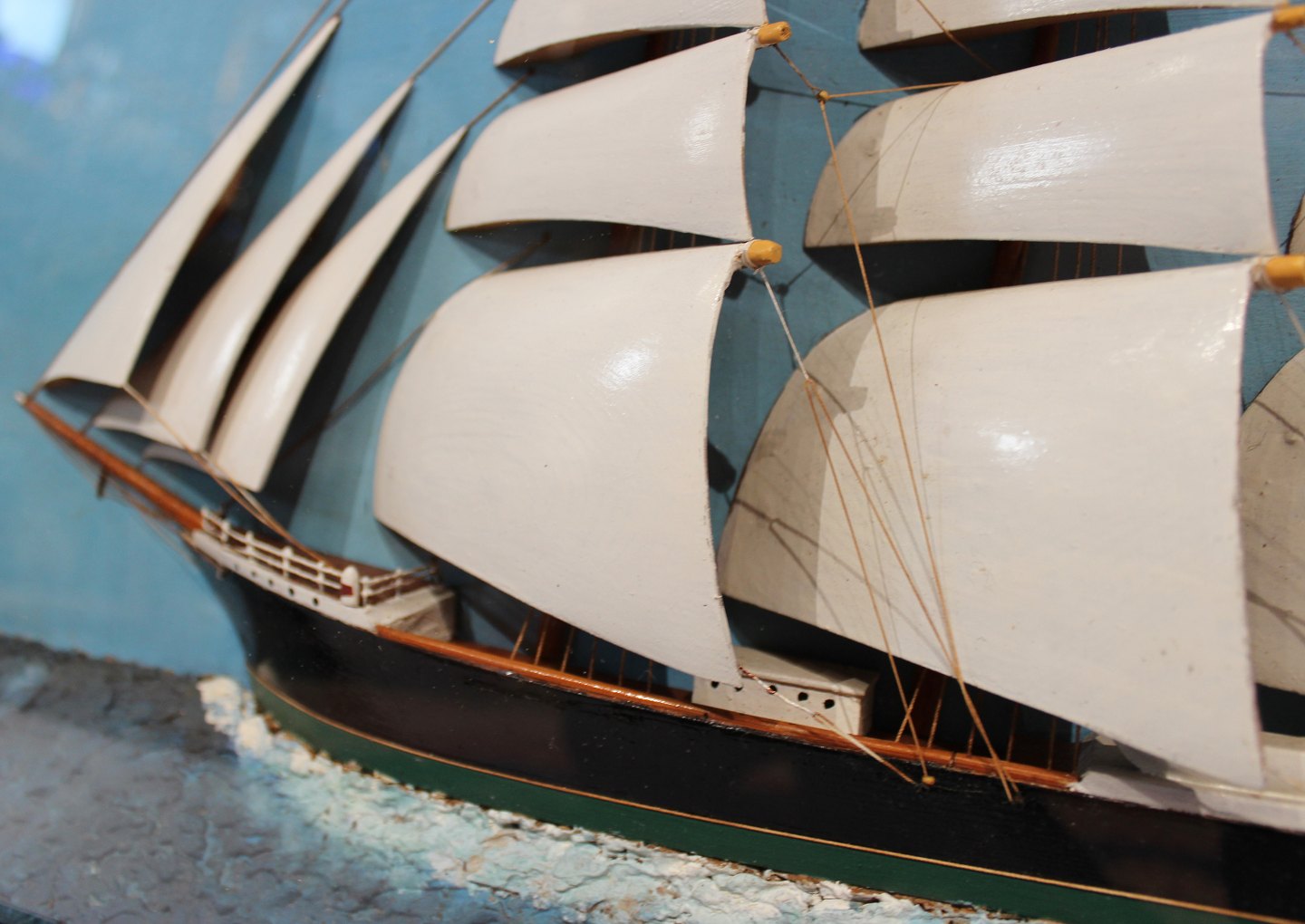 Beautifully decorated halfship in dark wooden frame from around the 1930s.