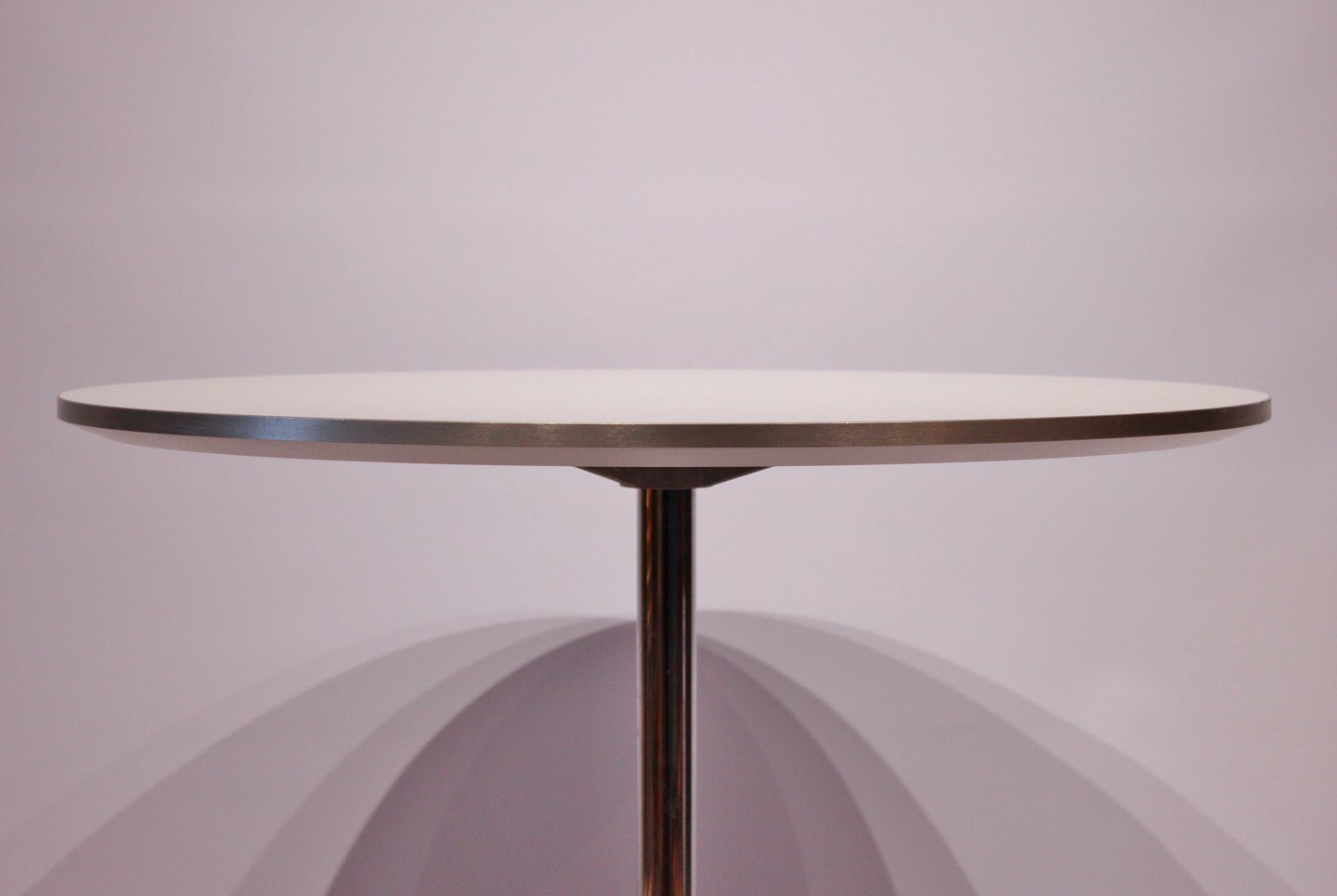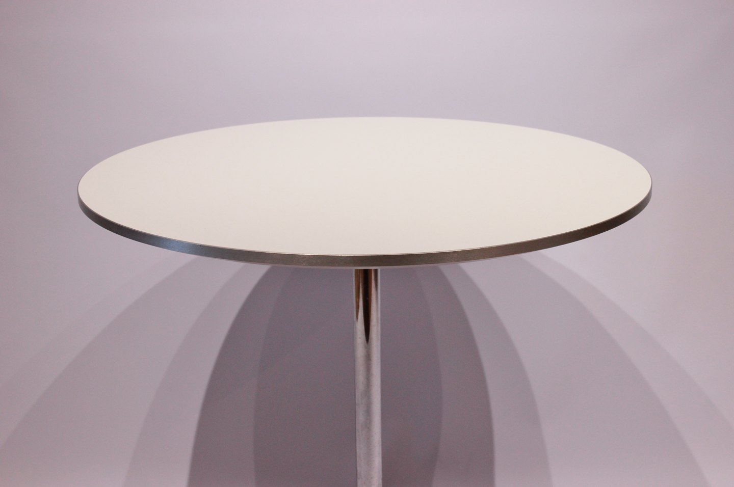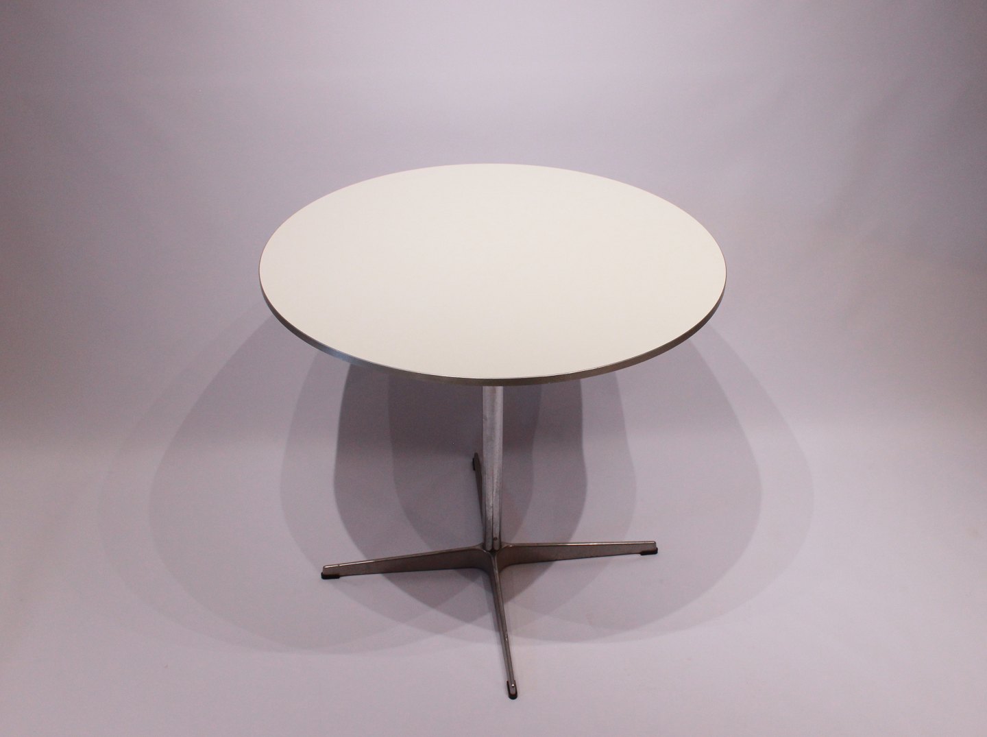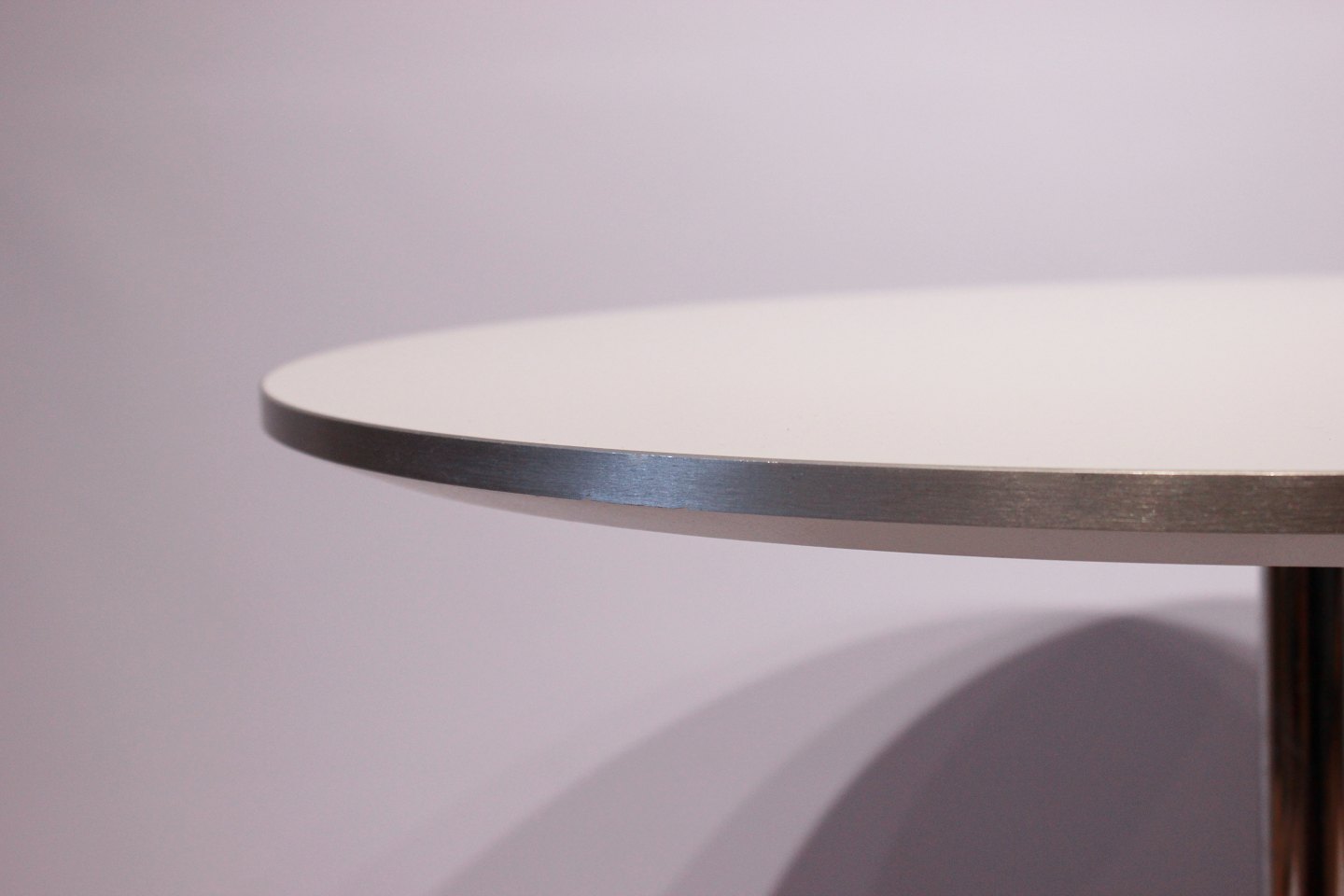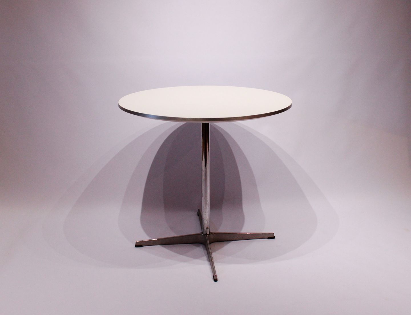 SoldRound Café table of white laminate tabletop with aluminum edge designed by Piet Hein and Arne Jacobsen and manufactured by Fritz Hansen in 2008.