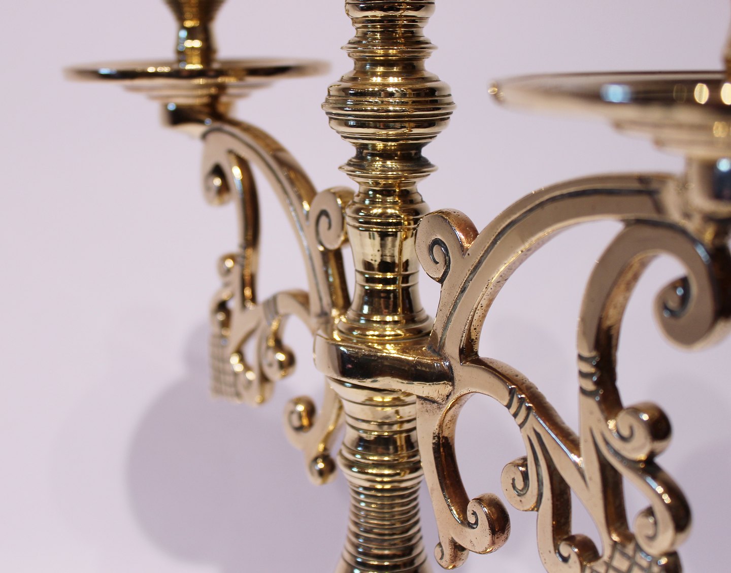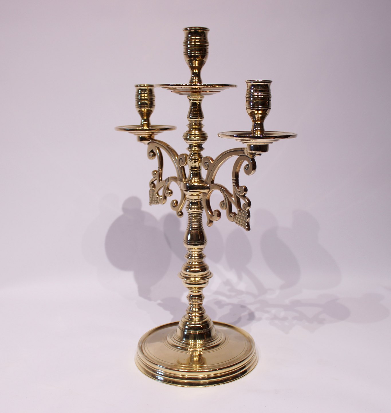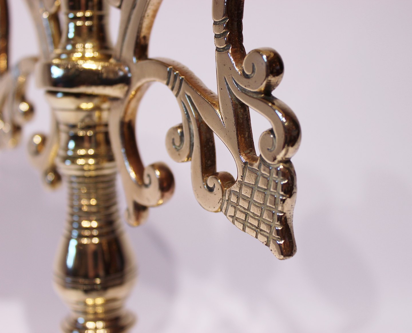 SoldA pair of large three armed brass candlesticks, in great vintage condition from around the 1890s.