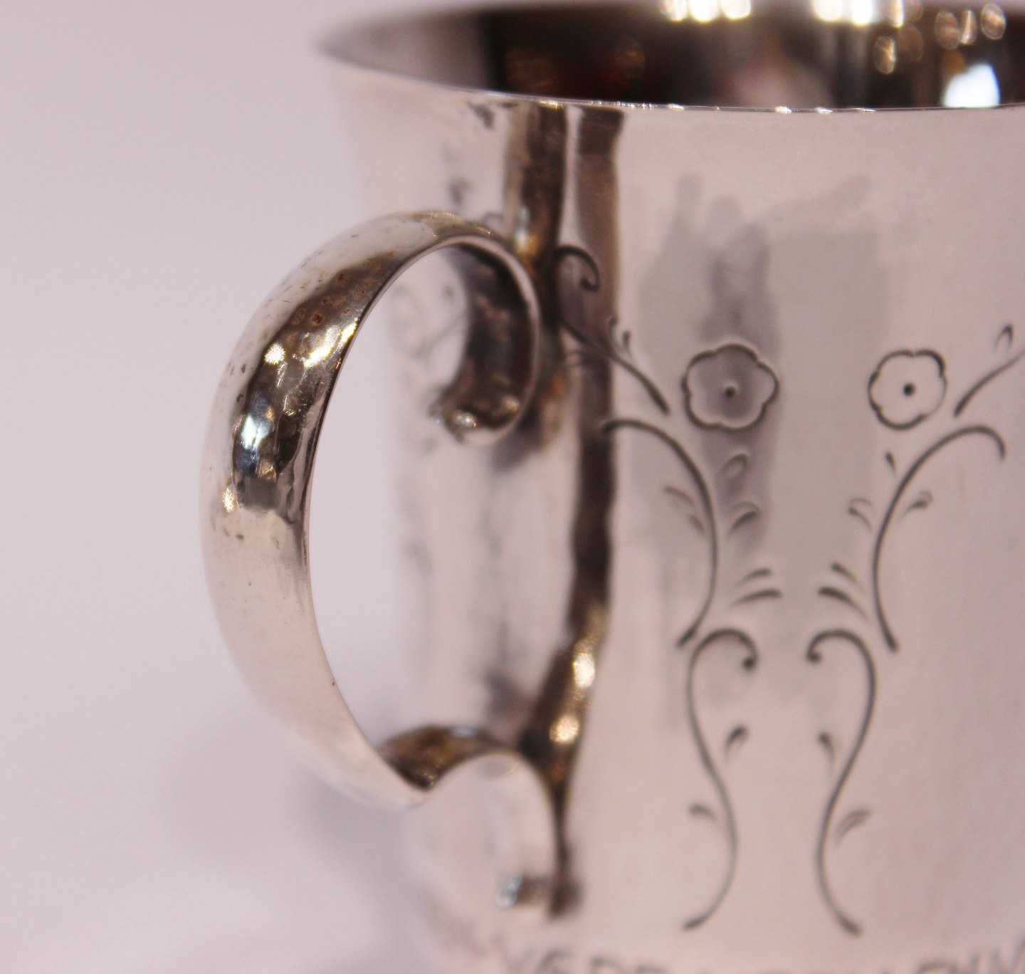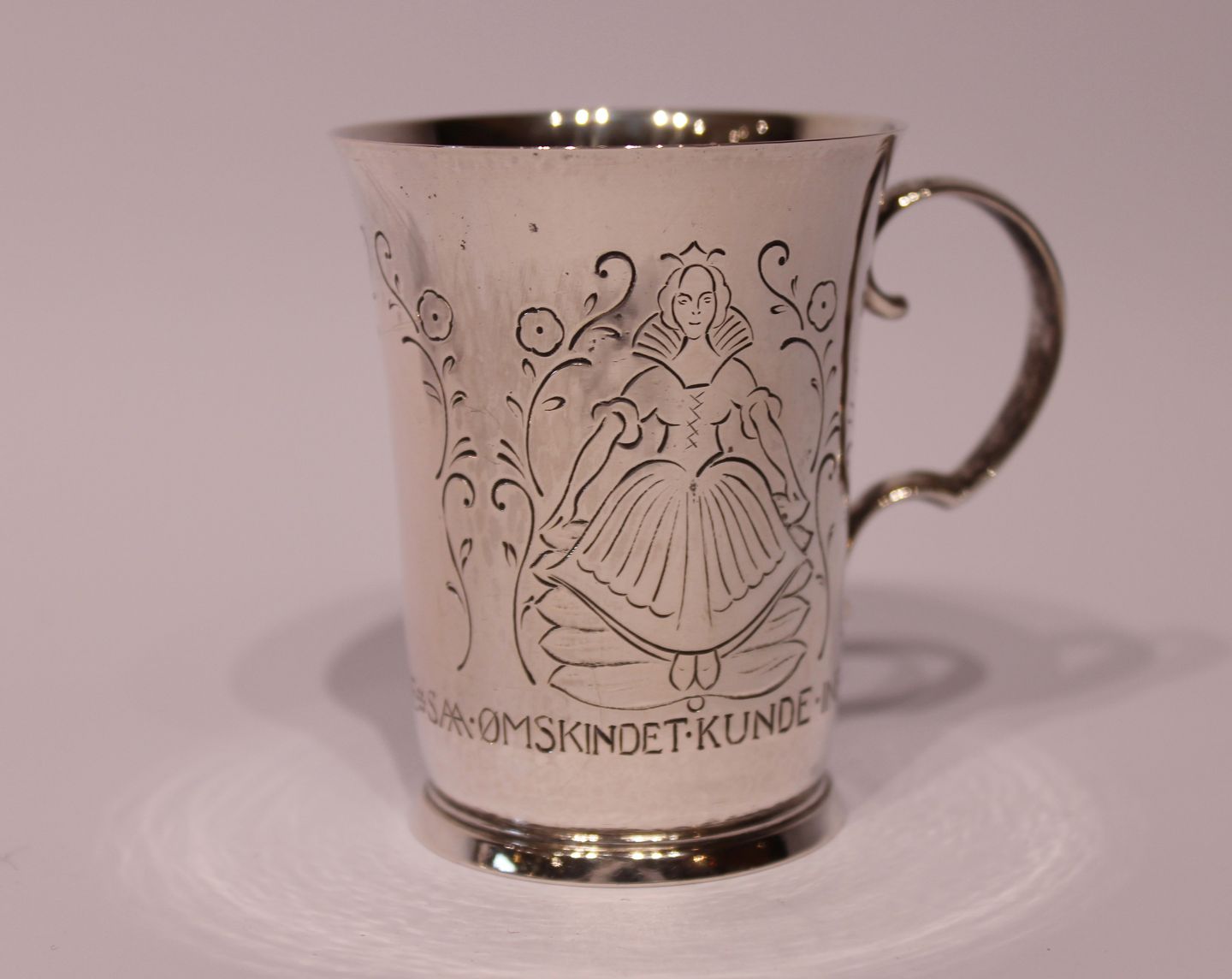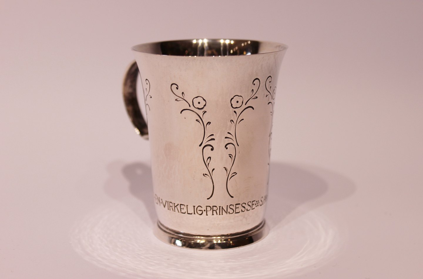 SolgtBørnekrus med tekst fra Prinsessen på Ærten fra 1929 i tretårnet sølv stemplet EN af Evald Nielsen. Kruset er dekoreret med teksten "Saa ømskindet kunde ingen være uden en virkelig prinsesse".