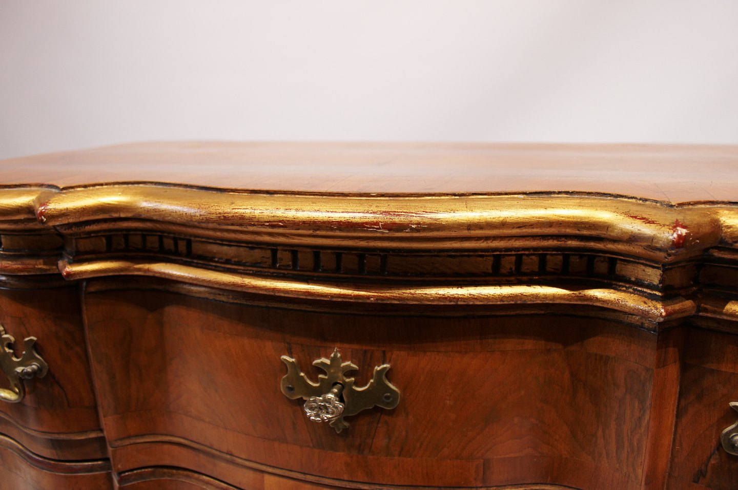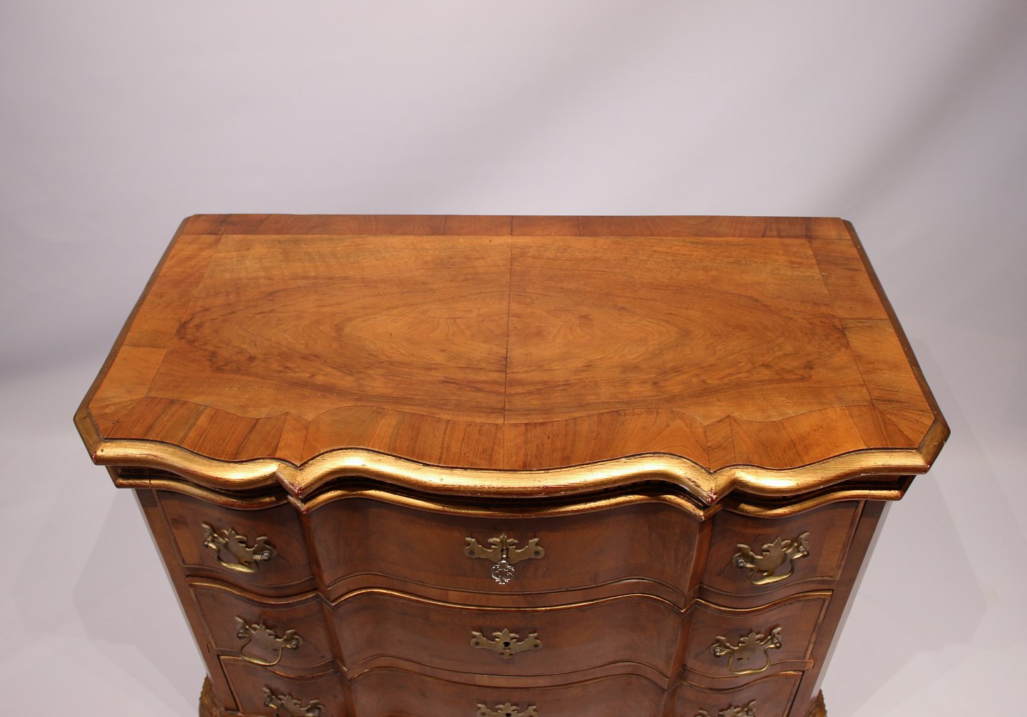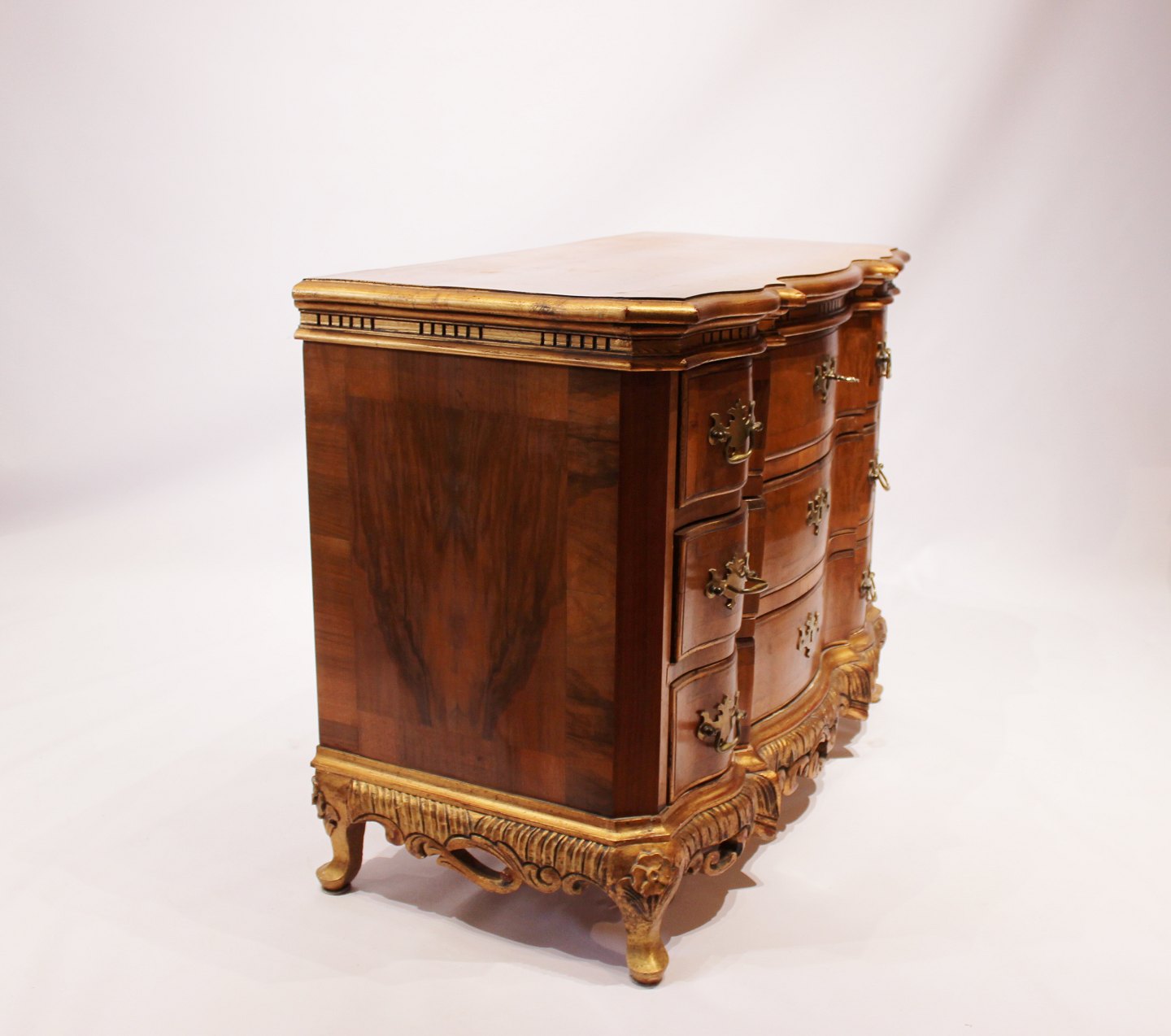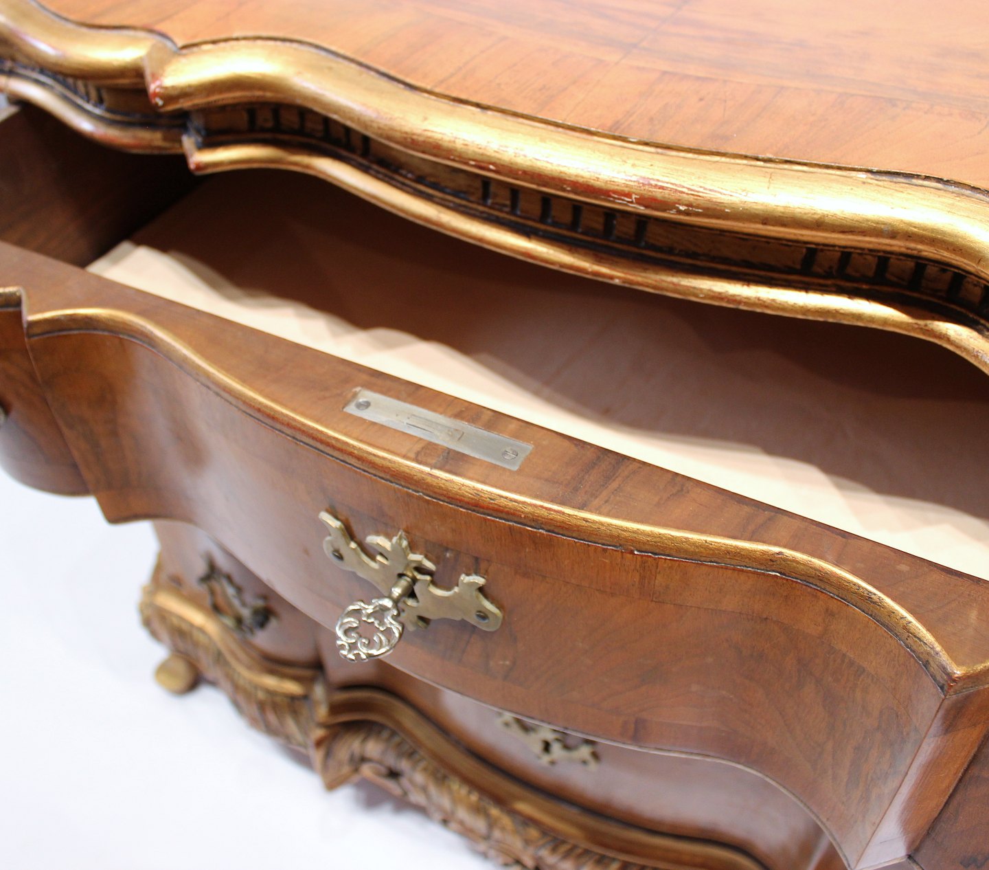 SoldRococo chest of drawers in walnut decorated with gold leaf from Denmark from the 1880s. The chest is in great vintage condition.