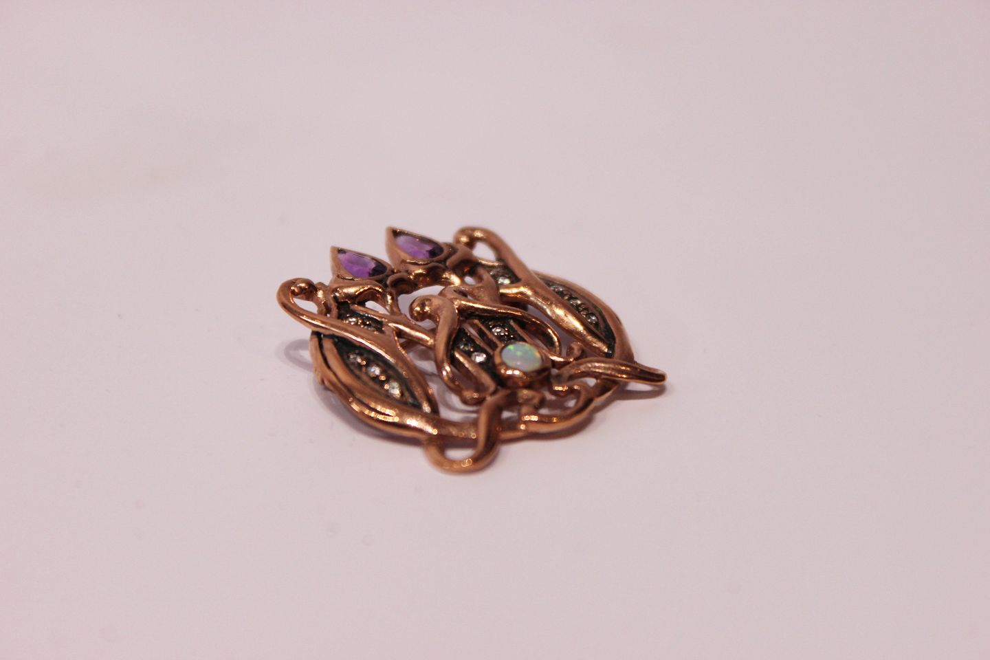 Fin broche dekoreret med forskellige sten.